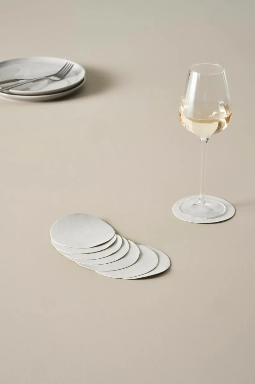 8-pack glasunderlägg i konstläder av polyuretan. De runda glasunderläggen ger en genomtänkt dukning och de skyddar bordet från fläckar av både vätska och värme samtidigt som glasen sätts ner tystare.