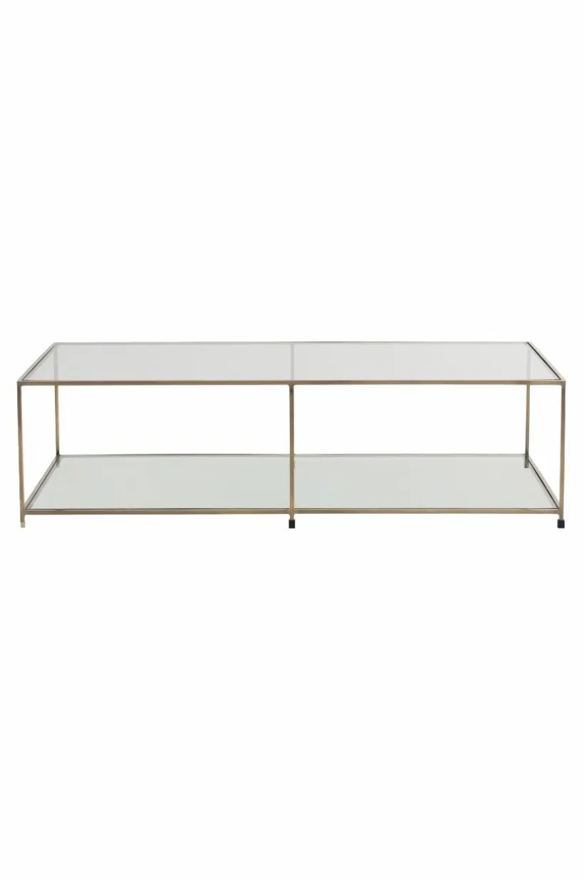 Rektangulärt soffbord i metall och klarglas. Den nätta, smidiga metallstommen har både avlastningsyta och borsskiva i klarglas vilket förstärker möbelns lätta känsla.