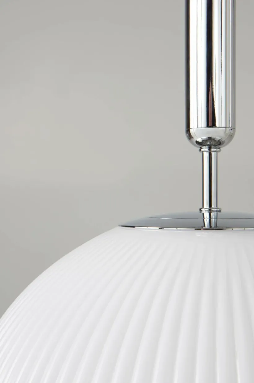 Taklampa med vacker, rund glaskupa som har effektfulla reliefränder. Den klarblå färgen lyser fint när du tänder lampan och den är mycket dekorativ även släckt. Lampans fäste och takkopp är av järn i kromfärg. Sladden är transparent. Lampan är jordad, klass 1. På grund av EU-regler behövs en separat takkontakt i vissa länder. Takkontakten ska vara jordad (klass 1) och köps separat.