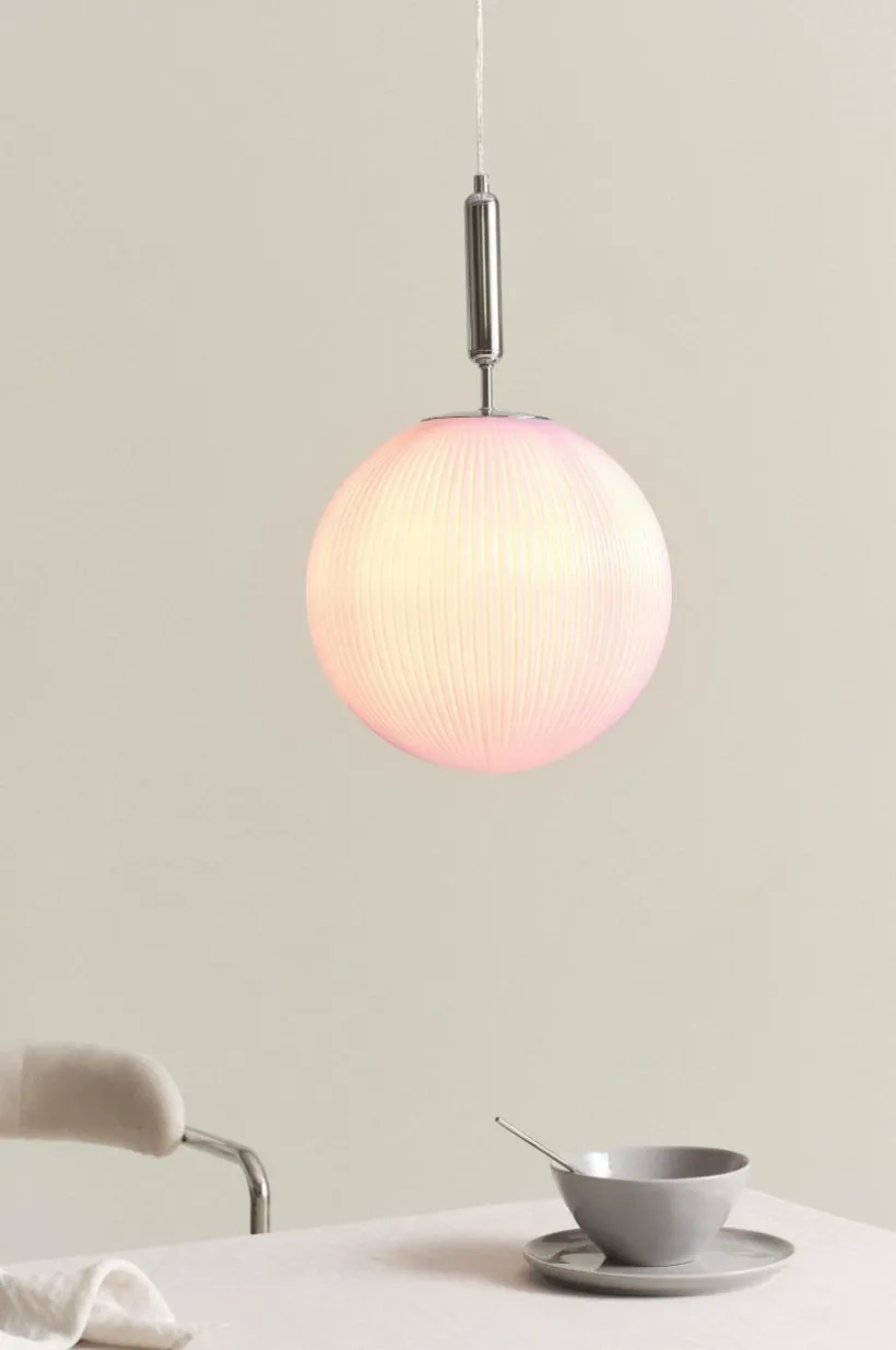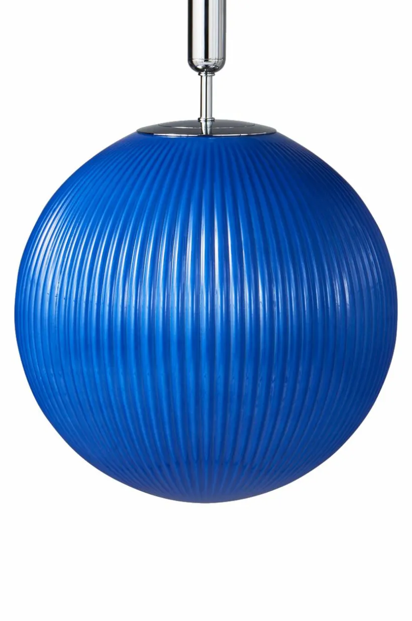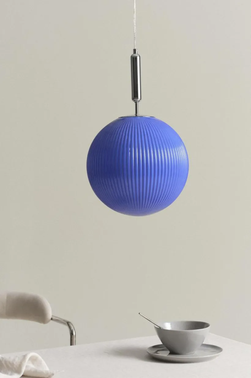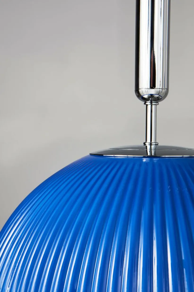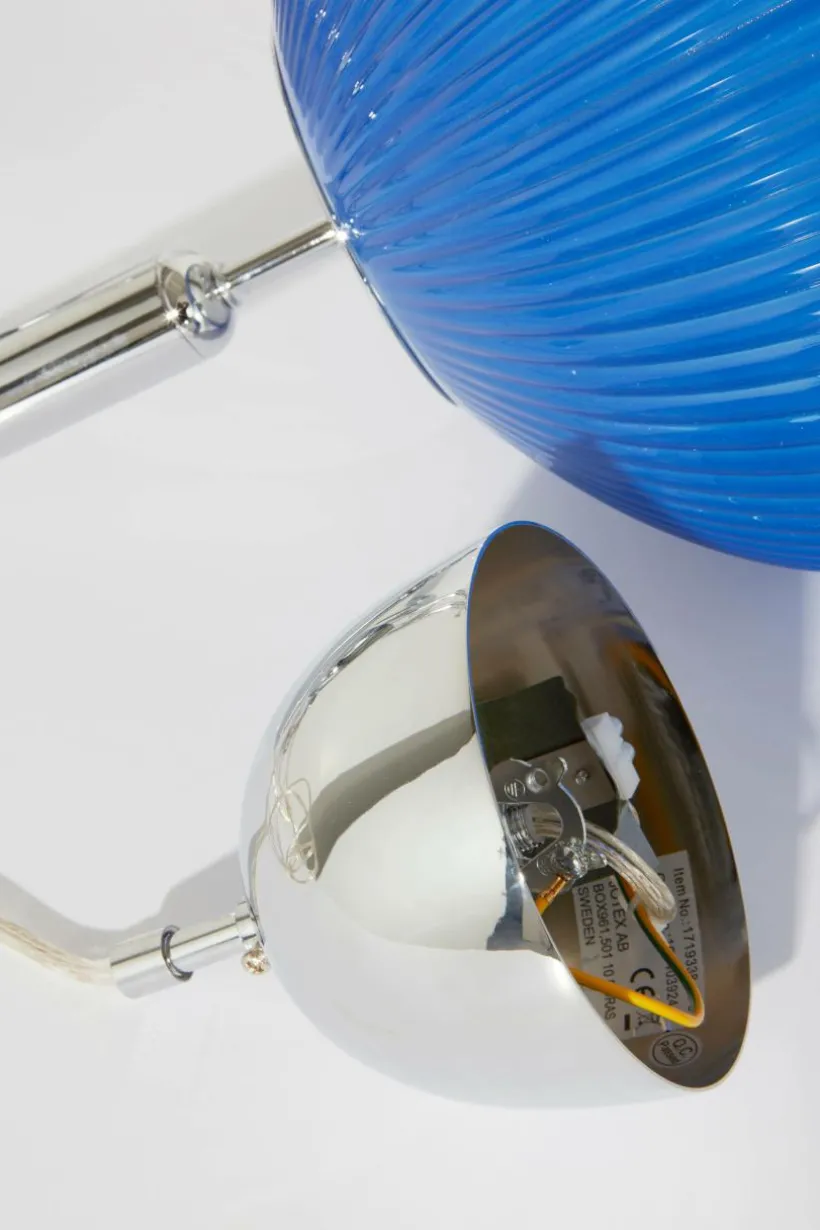 Taklampa med vacker, rund glaskupa som har effektfulla reliefränder. Den klarblå färgen lyser fint när du tänder lampan och den är mycket dekorativ även släckt. Lampans fäste och takkopp är av järn i kromfärg. Sladden är transparent. Lampan är jordad, klass 1. På grund av EU-regler behövs en separat takkontakt i vissa länder. Takkontakten ska vara jordad (klass 1) och köps separat.