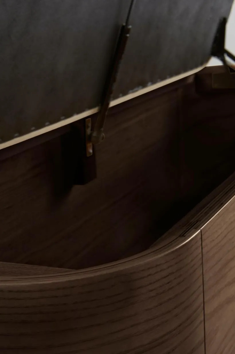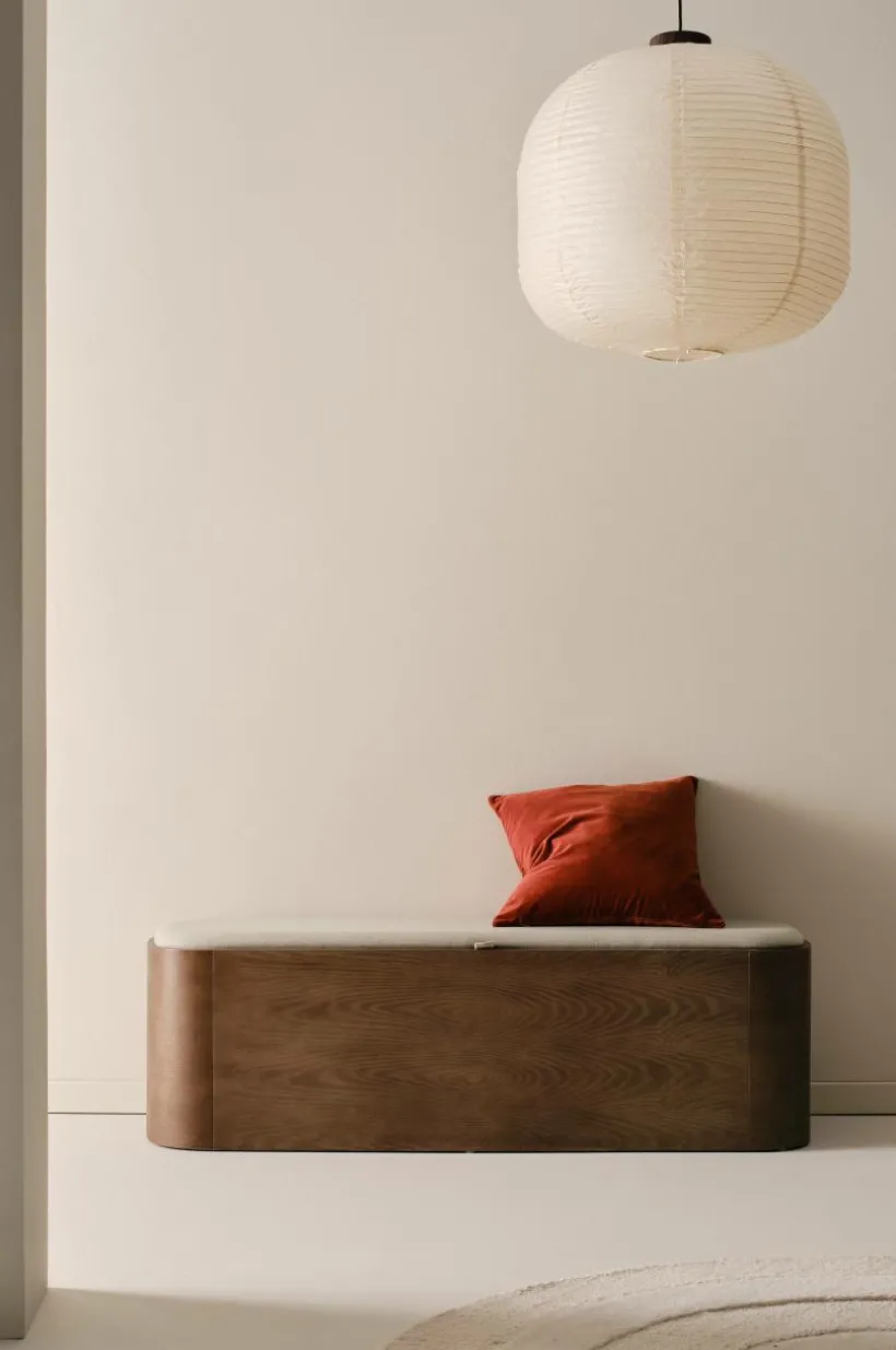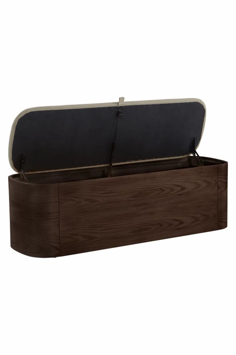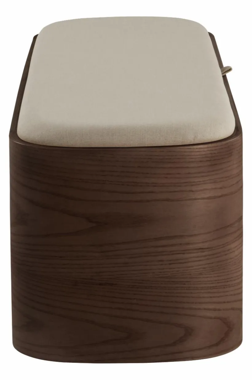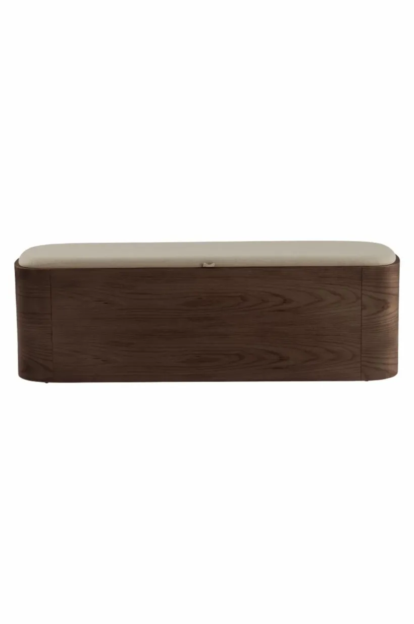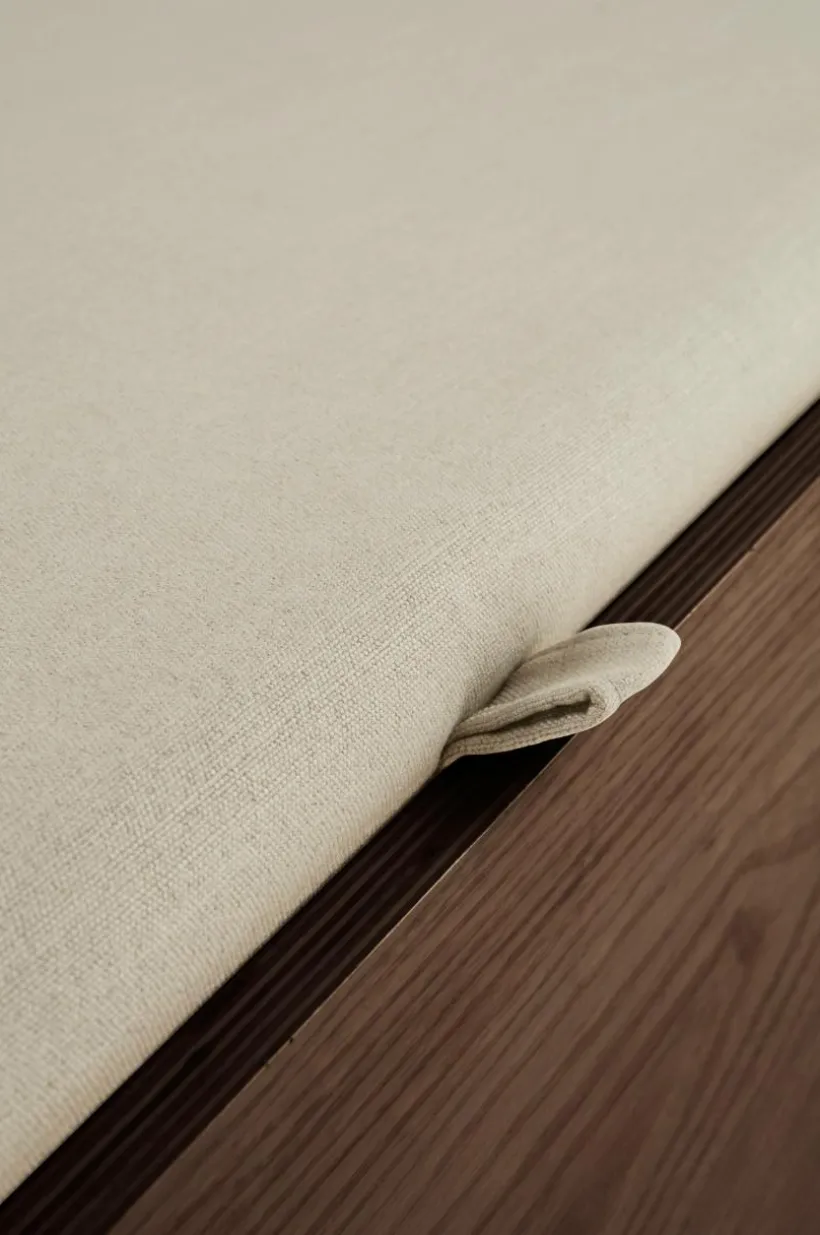 MOUJI är en bänk med utmärkt förvaringsfunktion. Du lyfter på sitsen och har en hel kista att förvara i. Bänken är av FSC-märkt plywood med vacker askfaner (ej FSC-märkt). MOUJI ger ett fräscht intryck i sin sköna, mjuka design. Den mjukstoppade sitsen är nedsänkt en aning i bänken och fungerar alltså också som lock. Dynan är klädd med ett tyg med linnelook och den har mjukstängande gångjärn som är dolda i bänken. En tygtamp i framkant gör det lätt att öppna. Bänken gör sig lika fint vid fotänden på sängen som i hallen eller i köket.