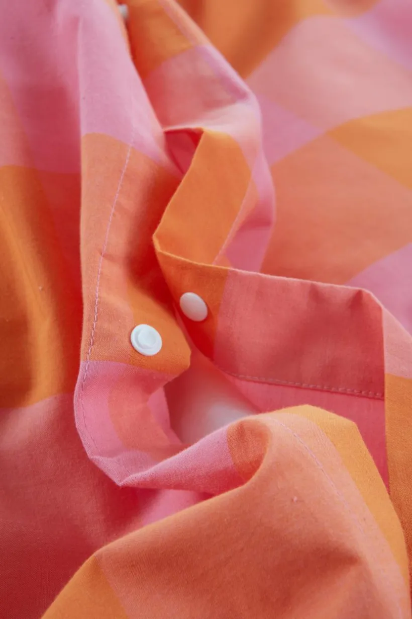 Påslakanset i tre delar med ett extra brett påslakan och två örngott i mjuk och skön bomullskvalité. Det garnfärgade rutmönstret går i läckra nyanser som ligger nära varandra i ton vilket skapar harmoni. Tyget är extra mjukt och bomull är som alltid svalt och skönt mot huden. Sängkläderna i bäddprogrammet NAIMA har dubbelsöm runt om. Påslakanet har små vita tryckknappar för tillslutning. Öppning i övre hörnen på påslakanet, som underlättar att trä påslakanet över täcket. Trådtäthet på 184 tc. (Trådtätheten talar om antalet trådar, thread counts, per kvadrattum i ett tyg. Ju högre trådtäthet desto högre kvalité.)