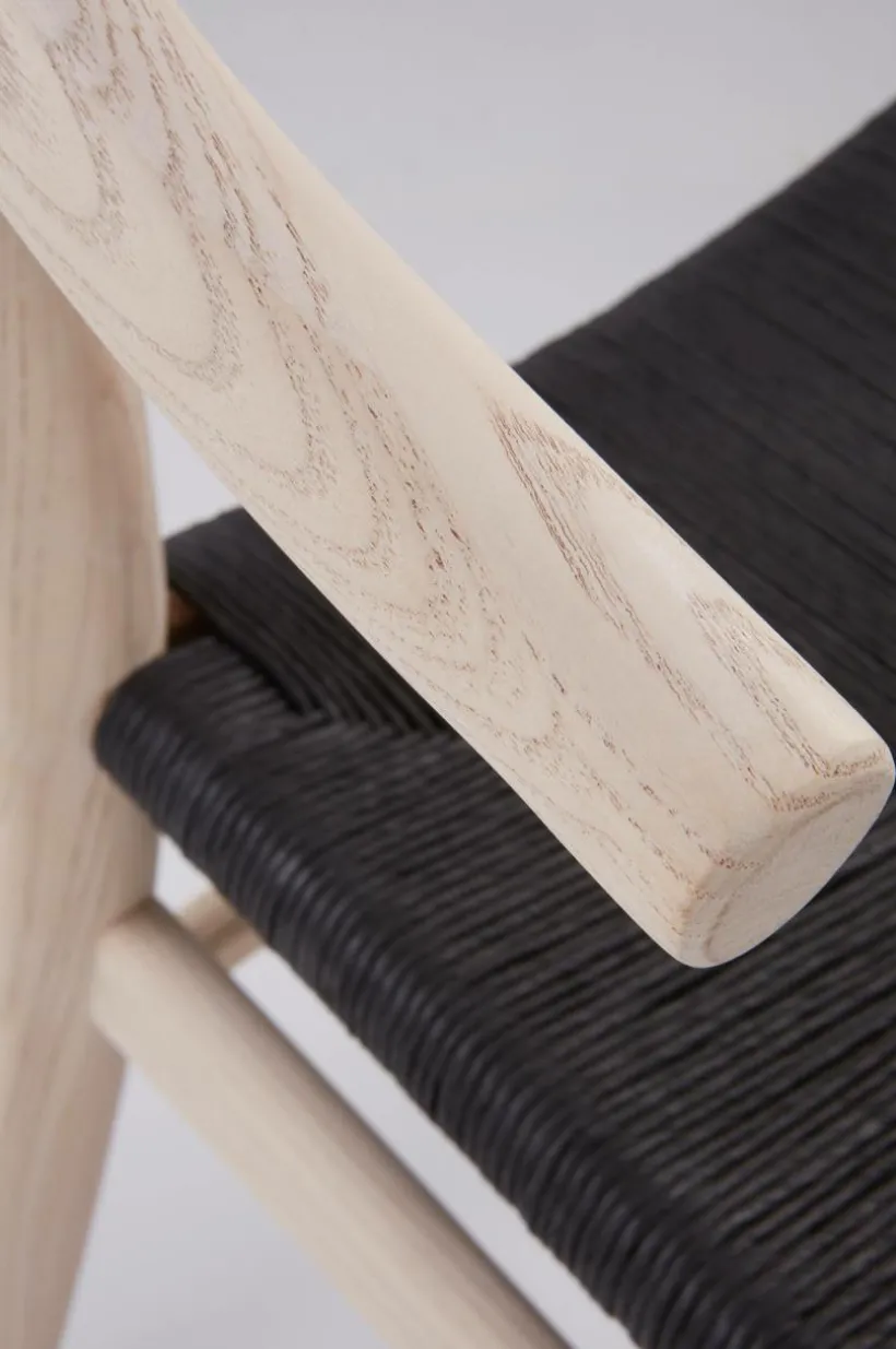 Stol av massiv alm. Träfärgad, svart/natur och valnötsfinish/natur är ytbehandlade med lack. Vitsåpad alm med ljus och svart sits har såpad yta utan lack. Sits av papperssnöre. Robust alm i kombination med sitsen av papperssnöre blir en vacker kontrast och ger bra sittkomfort.