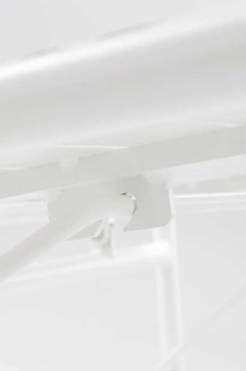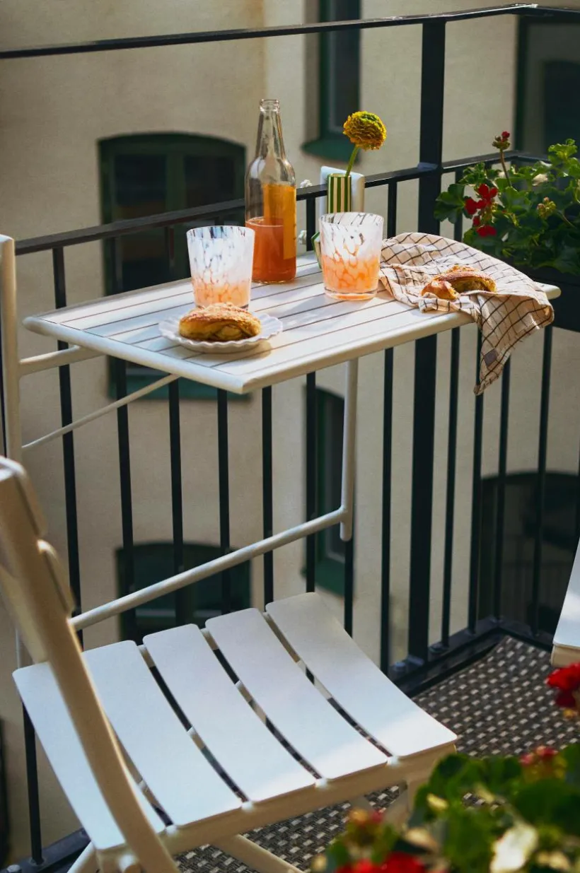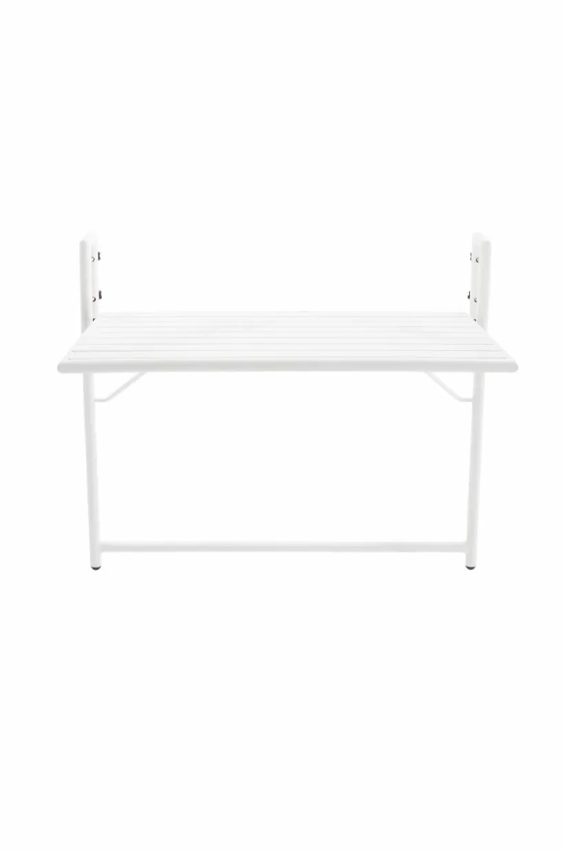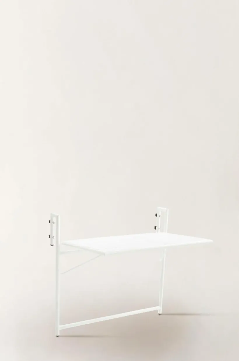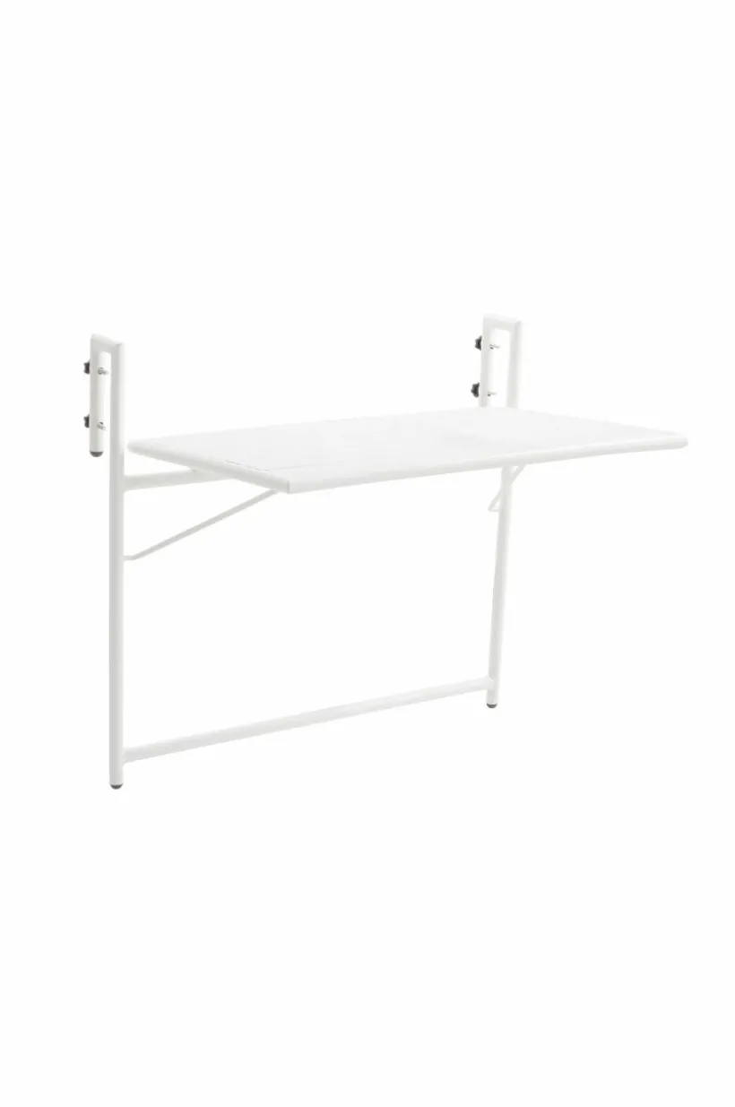 Balkongbord av pulverlackerad aluminium med matt yta som inte bländar i solskenet. Praktisk modell som du fäller upp när du behöver bordet, annars kan det hänga nedfällt utan att ta plats. NAVONA tål att hänga kvar utomhus på balkong- eller altanräcket. Du slipper bära så fort du vill sitta ute. Låg vikt.