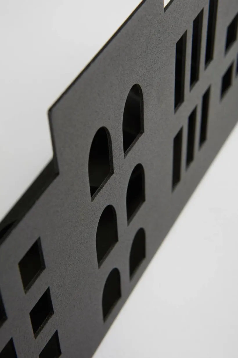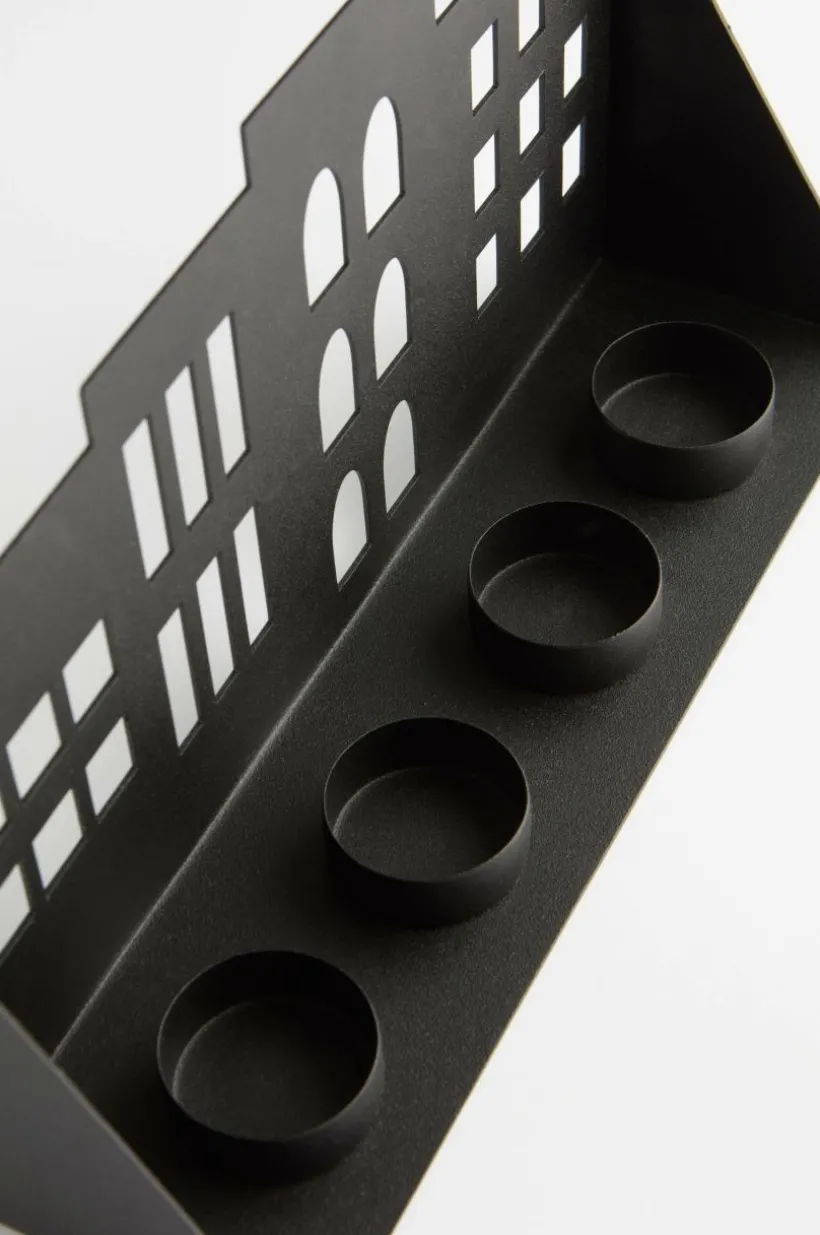 Ljuslykta i järn utformad som en hussilhuett. Den här snygga ljuslyktan har fyra ljushållare och skapar en varm, inbjudande atmosfär. Perfekt för mysig heminredning.