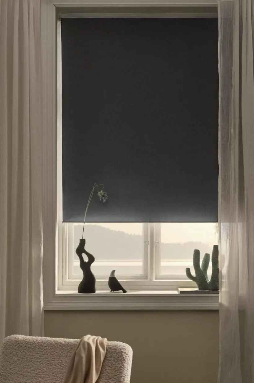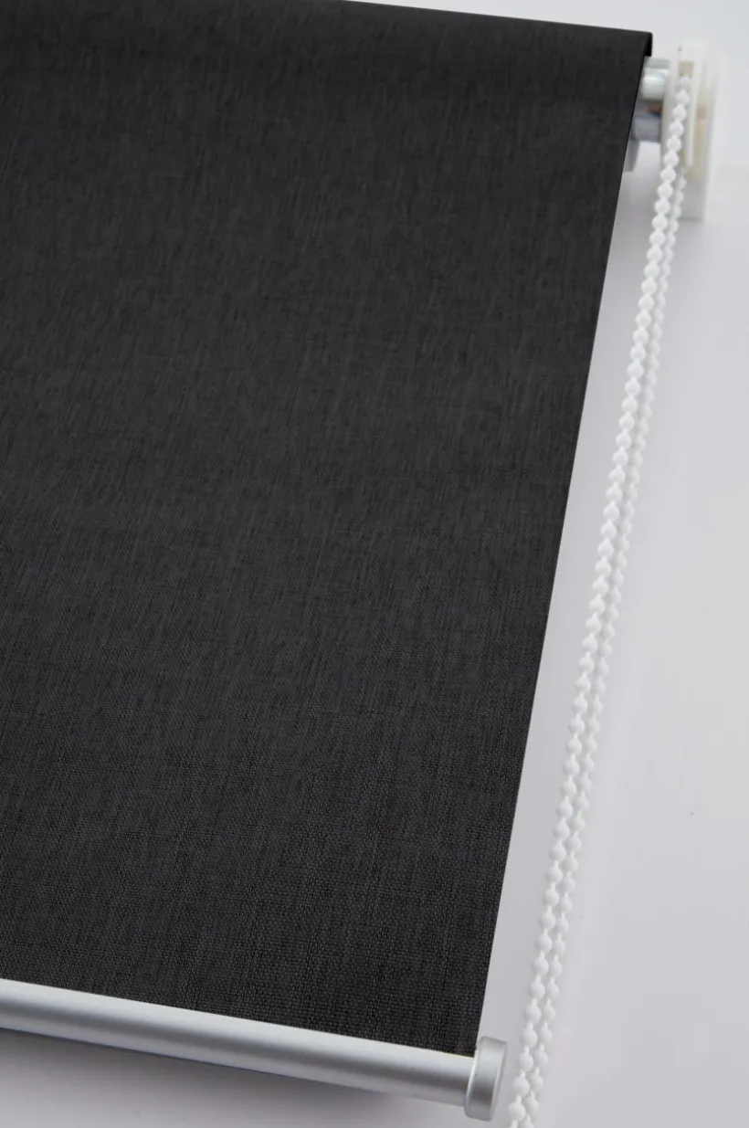 Mörkläggande solskyddsgardin (funktionsgardin) av polyester, hälften kommer från återvunnet material. Tyget blockerar ut ljuset och mörklägger sovrummet, tv-rummet eller barnkammaren. Ljusblockerande beläggning på baksidan. Rullgardinen hissas upp och ned med hjälp av en liten kulkedja vid sidan. Fästen ingår. Enkel att montera. Monteringsanvisning medföljer.