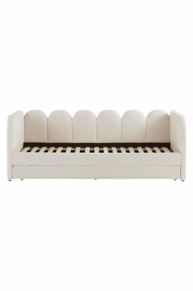 Stomme inklusive ribbotten är av FSC-certifierat furu och FSC-certifierad plywood. Hela sängen är klädd i ett tyg av polyester, hälften av polyestern kommer från återvunnet material. Sängen har mjuk vaddering runt om. Klädseln är ej avtagbar. Extrasängen är försedd med hjul och enkel att dra ut, även den har ribbotten. Nederdelen kan förstås också användas till förvaring. Madrasser medföljer ej. Viss montering krävs. Monteringsanvisning medföljer.