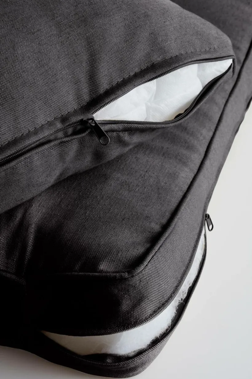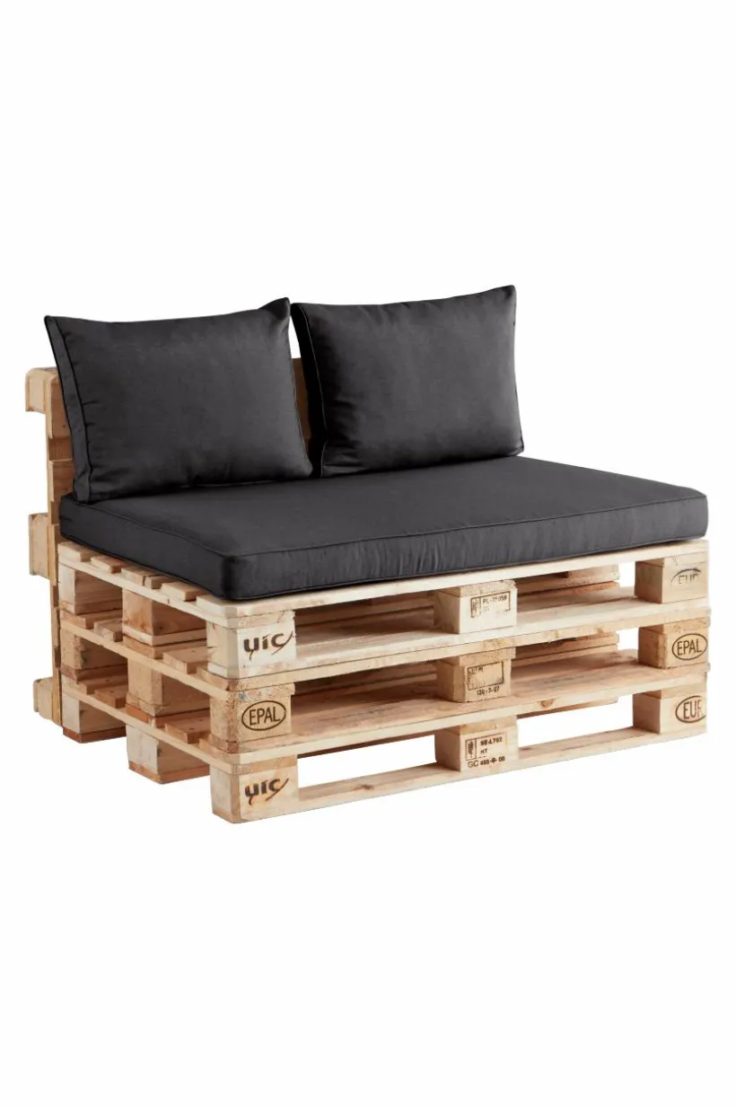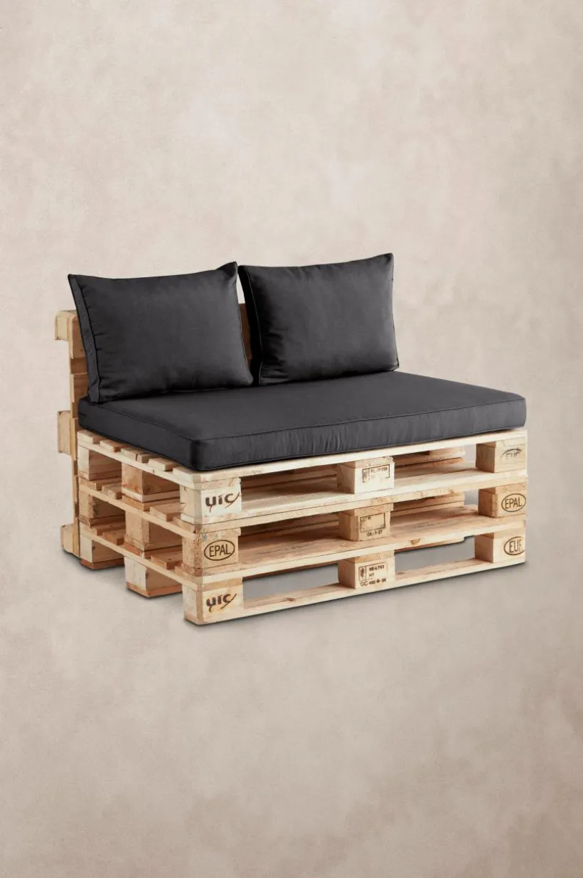 Dynset till utemöbler. Setet innehåller en sittdyna och två ryggkuddar som är anpassade för möbler som tillverkats av lastpallar (typen Eur-pall). Dynorna har klädsel av bomull, polyester och återvunnen fiber som stoppats med skumfyllning och fiberfyllning. För att fixa en sitthörna av lastpallar behöver du inte vara särskilt händig och med ett praktiskt dynset som passar blir det nästan för enkelt för att vara sant. Klädseln är avtagbar och har dragkedja längs ena kanten.