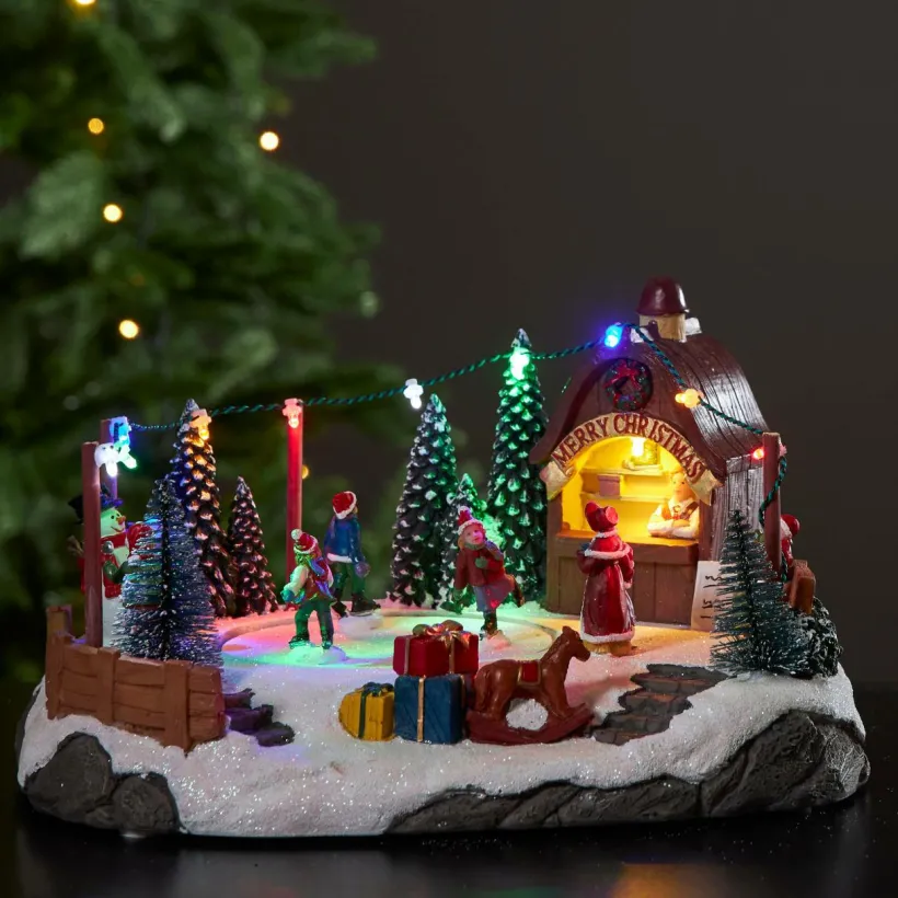 Stämningsfull dekoration till jul eller advent med en lite skridskobana som roterar och spelar musik. Vid banan står en snögubbe och en lite ljusslinga lyser fint över skridskobanan. Produkten driv av batteri och har timerfunktion. Placera på ett bord eller en hylla för en härlig julstämning. 3 batterier AA ingår ej.