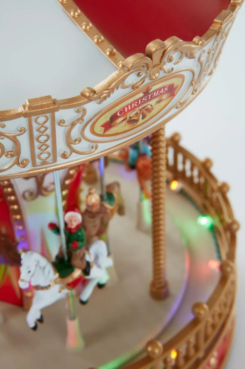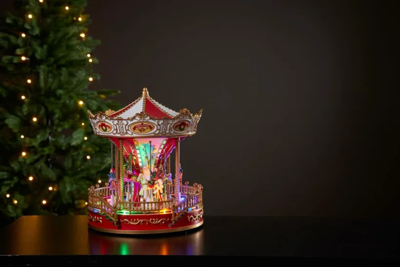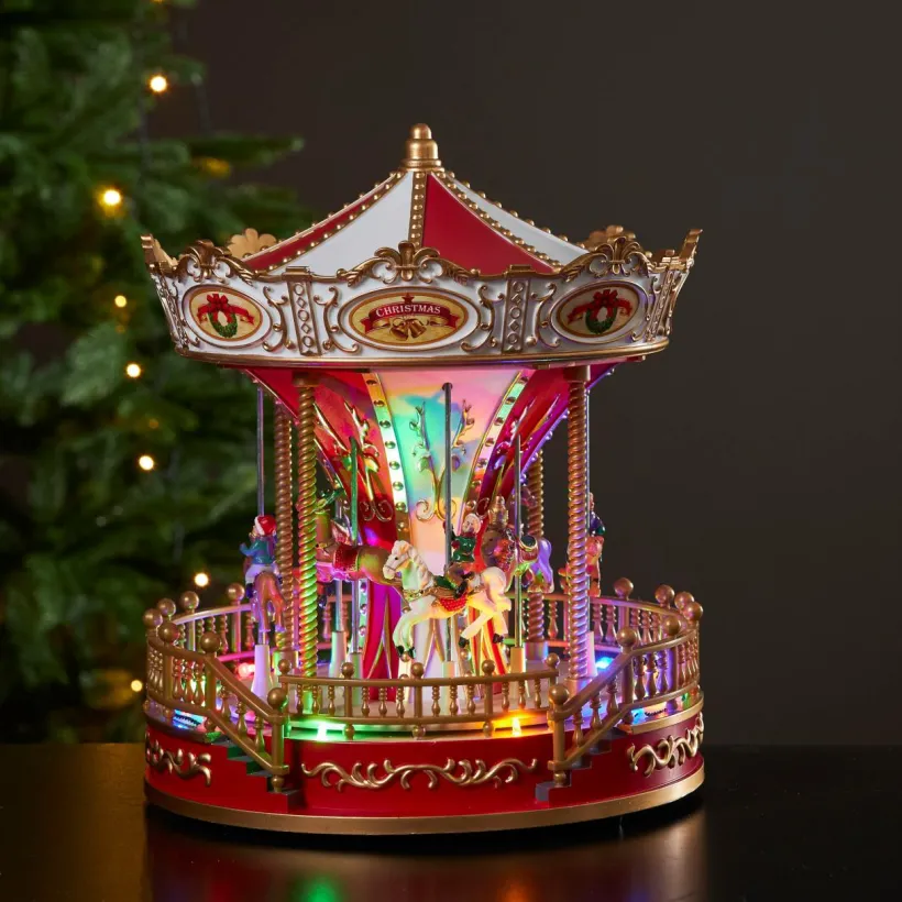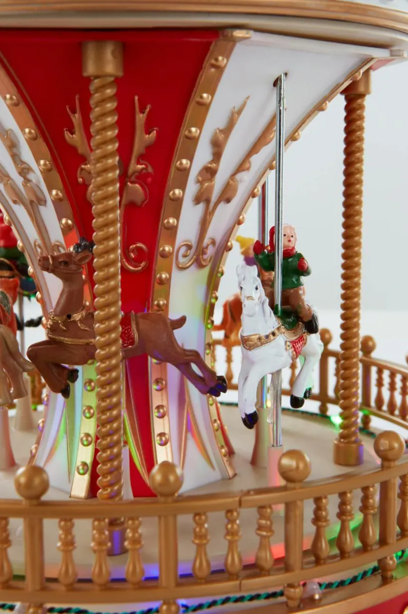 Perfekt jul dekoration med fina detaljer, snurrande karusell med 8 olika julsånger. Välj mellan funktionerna ljus eller ljus/rörelse/musik. Placera den på ett bord och du får en härlig julkänsla. Drivs av 3 AA batterier, ingår ej. Timerfunktion.