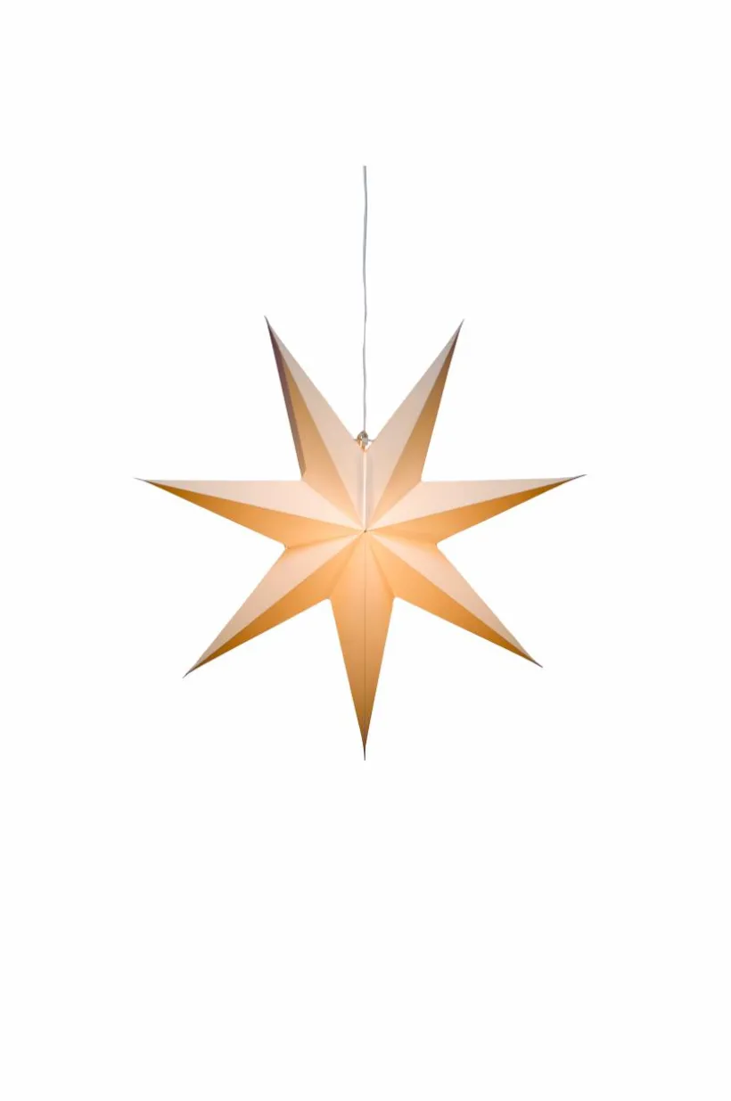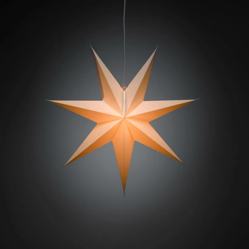 Hängande pappersstjärna med 7 uddar. Sladdställ med 5 meter anslutningssladd ingår, E14-sockel. Sladdströmbrytare. Diameter 60 cm.