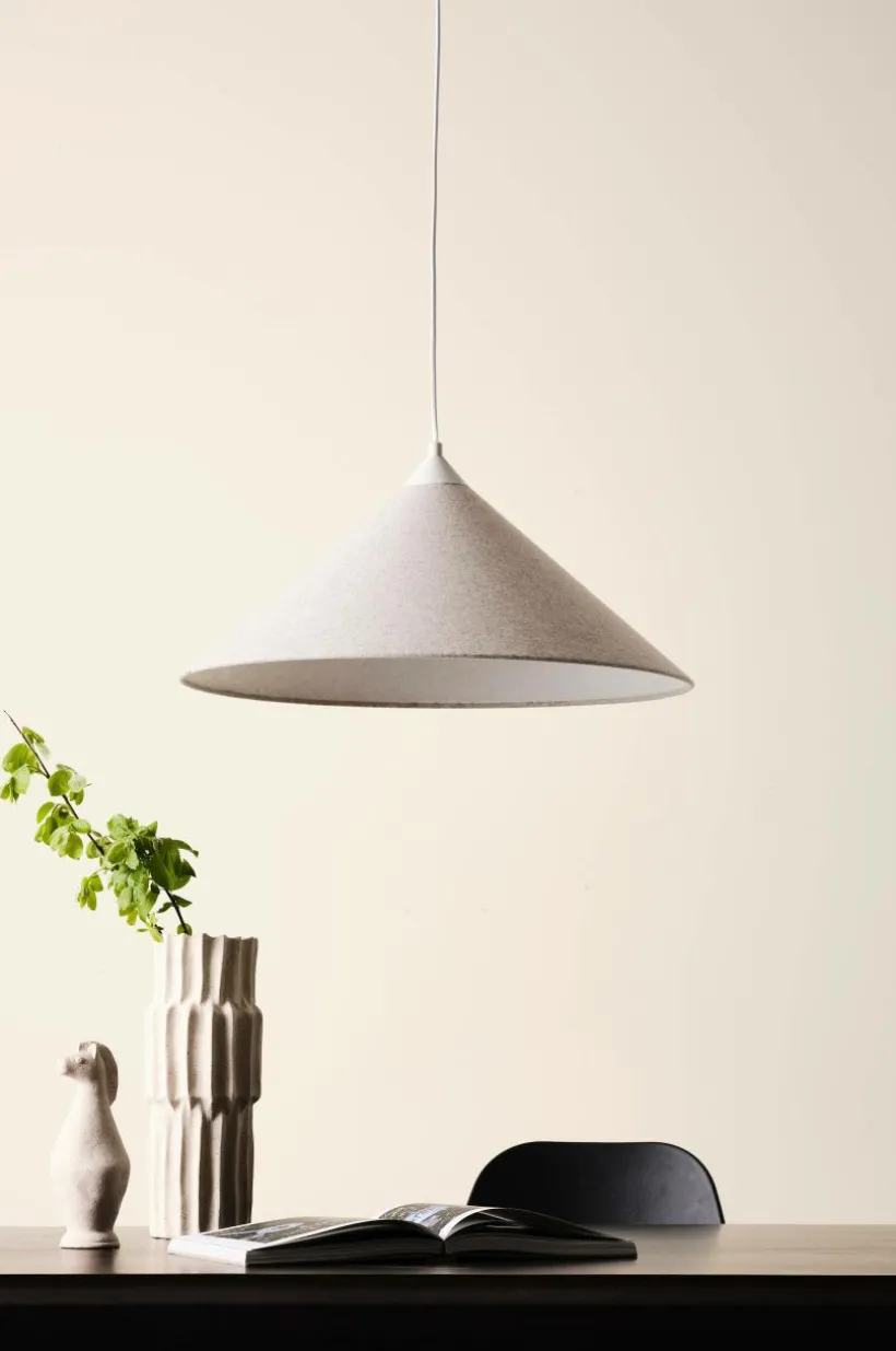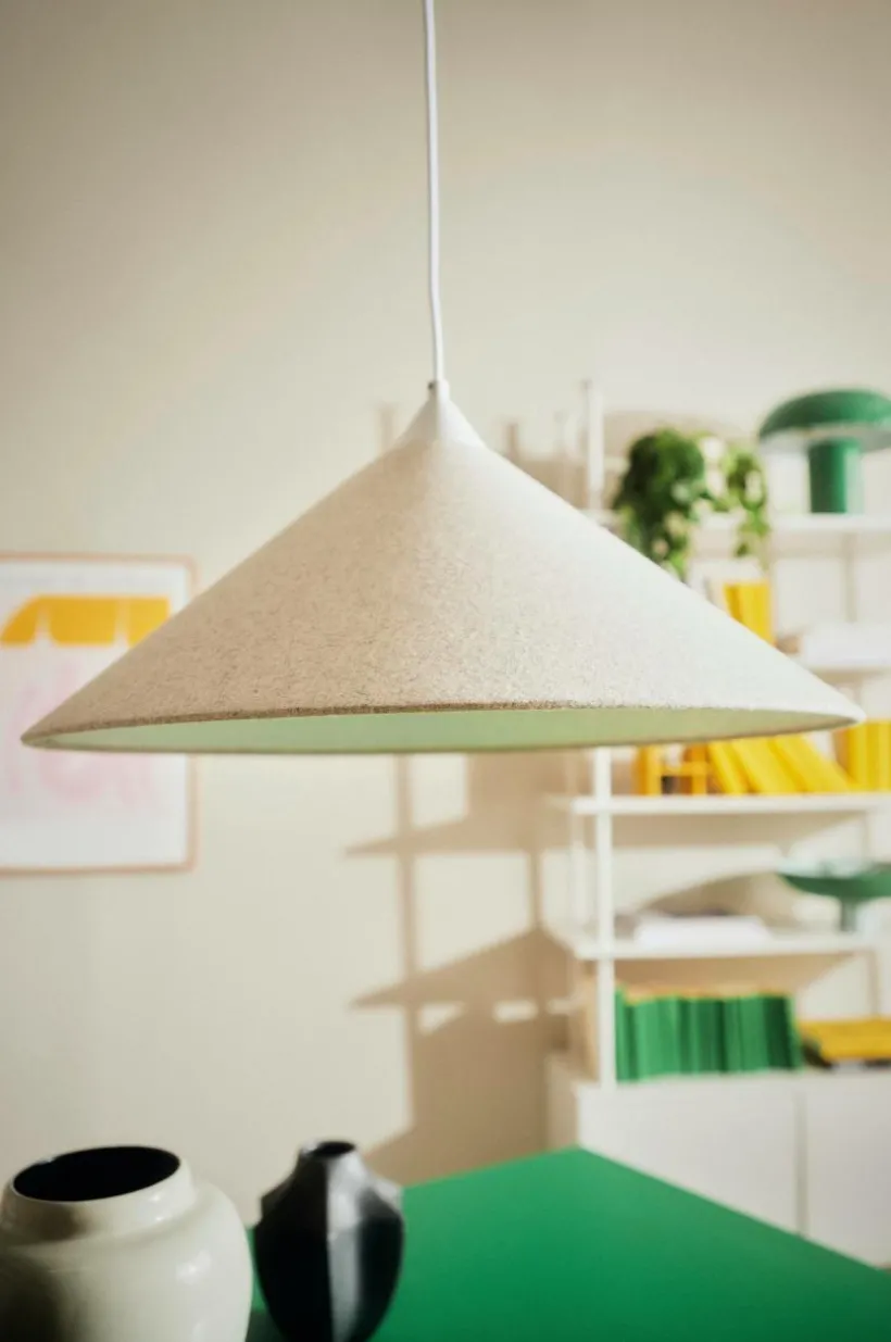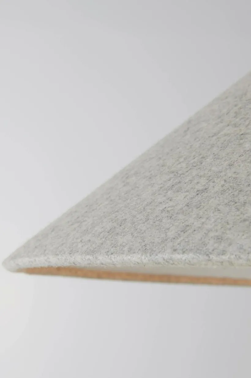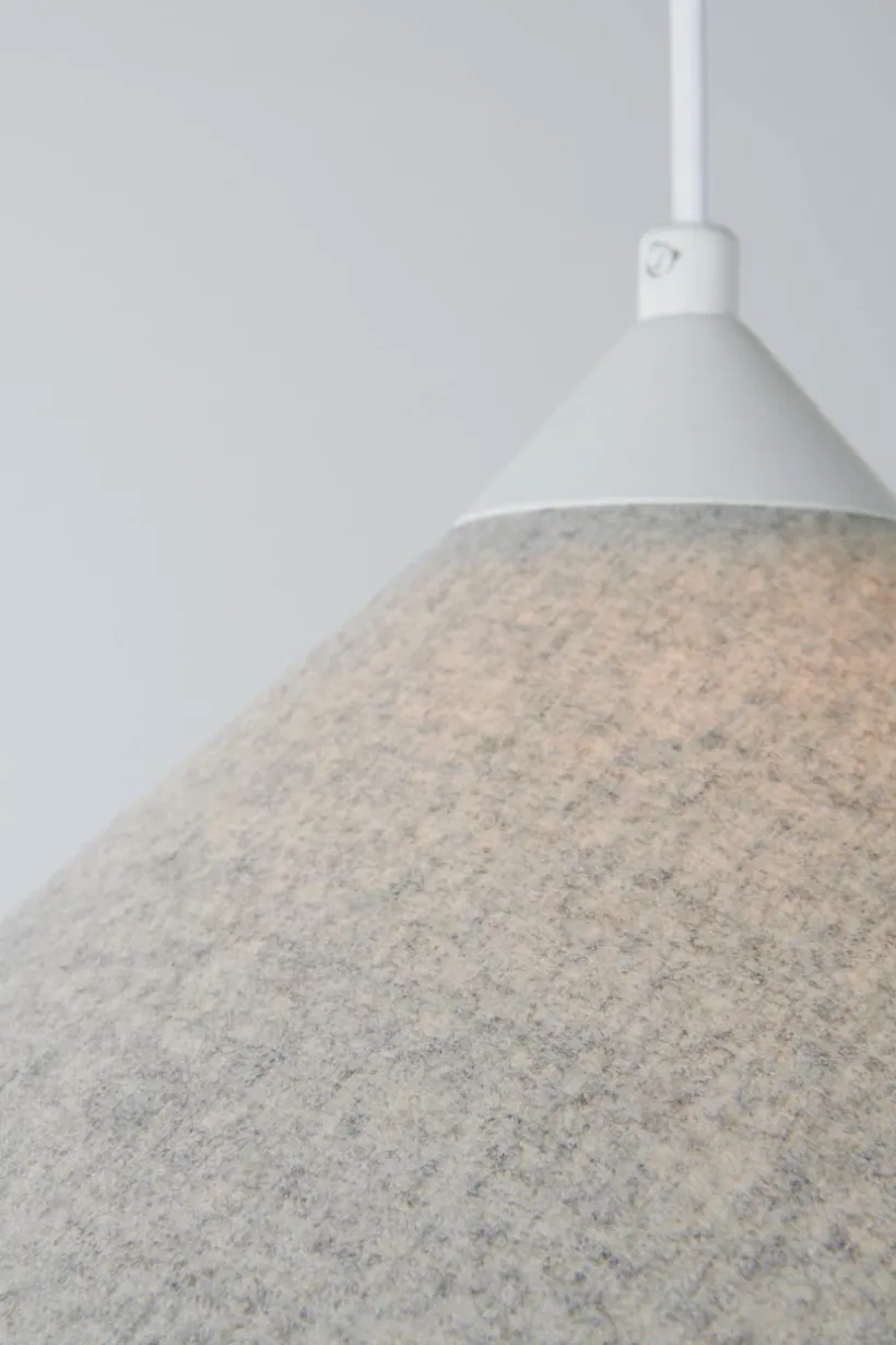 Taklampa av mjukt filttyg i naturnära färg. Materialet i denna lampan förbättrar akustiken i rummet. Plastsladd. Lampan är ojordad, klass 2. På grund av EU-regler behövs en separat takkontakt i vissa länder. Takkontakten ska vara ojordad (klass 2) och köps separat.
