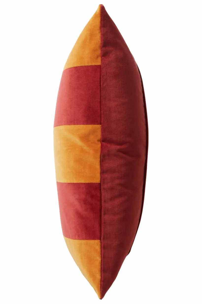 1-pack kuddfodral i mjuk sammet av bomull med matt yta. Framsidan på kuddfodralet är sytt i lapptäcksteknik och blockränderna är i väl valda nyanser. Sammetstyget har fin lyster och ränderna skimrar i vackra nyanser med ljuset, tyget är tvättat för extra mjuk känsla. Baksidan är enfärgad i en av rändernas kulör. Dold dragkedja på baksidan. Kuddfodralet är fodrat med mikrofiber av polyester. Tygets gramvikt 230 g/m².