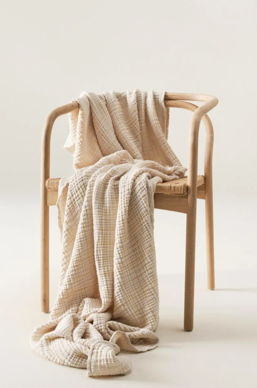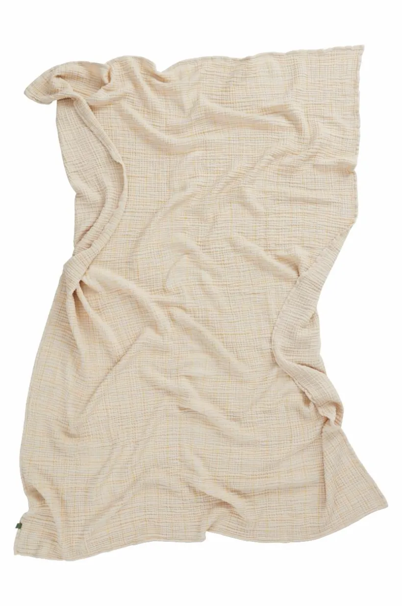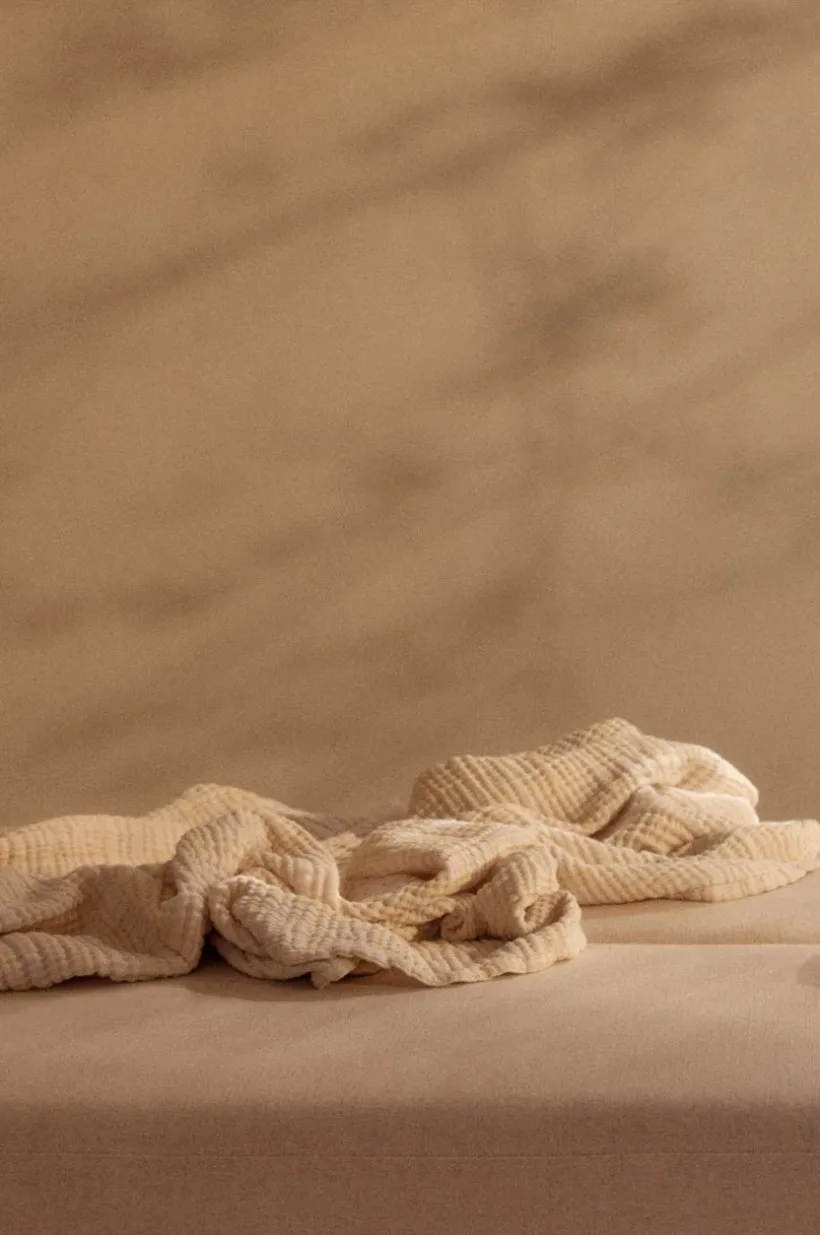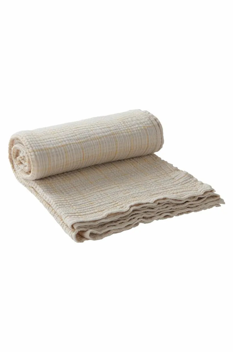 RUTHY är en härlig och luftig pläd i muslinkvalité av bomull med bandkant runt om. Muslin är en behaglig kvalité som vävts i flera lager, RUTHY är fyralagers och blir bara mjukare ju mer den används. Pläden är garnfärgad vilket innebär att garnet färgats innan vävning och pläden har rutig struktur. RUTHY är alldeles lagom tjock och värmer skönt, mycket tack vare luften som skapas i den speciella vävtekniken, gramvikt 210 g/m².