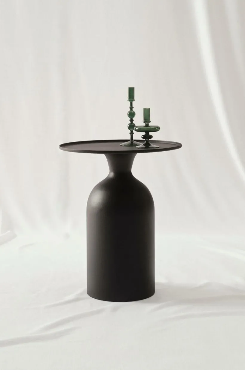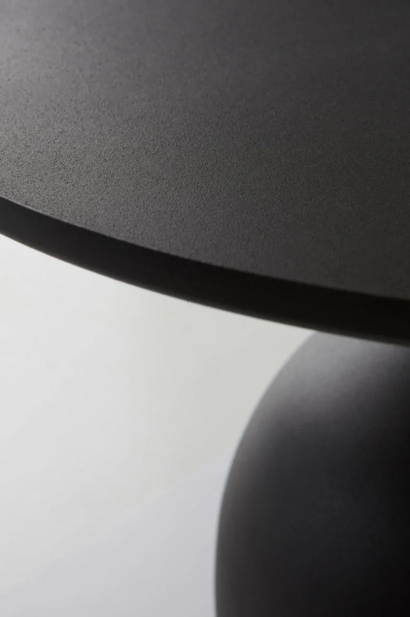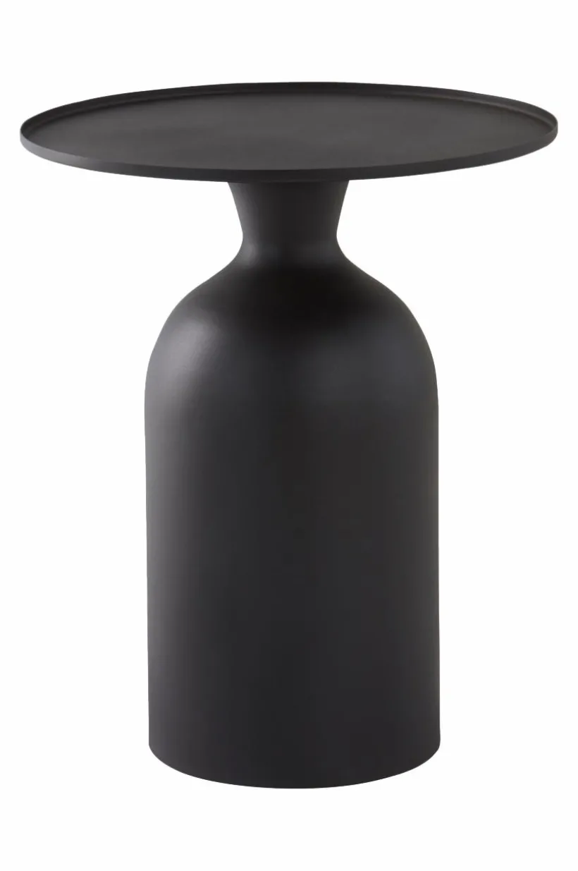 SARGANS är ett runt sidobord av järn i modellen pelarbord. Bordsskivan har en liten kant runt om. Foten är ihålig så bordet blir lätt att hantera. Botten är klädd med tyg för att skydda golvet. Metallens yta är pulverlackerad med lite struktur.
