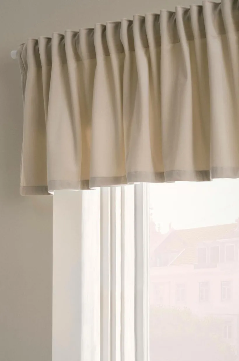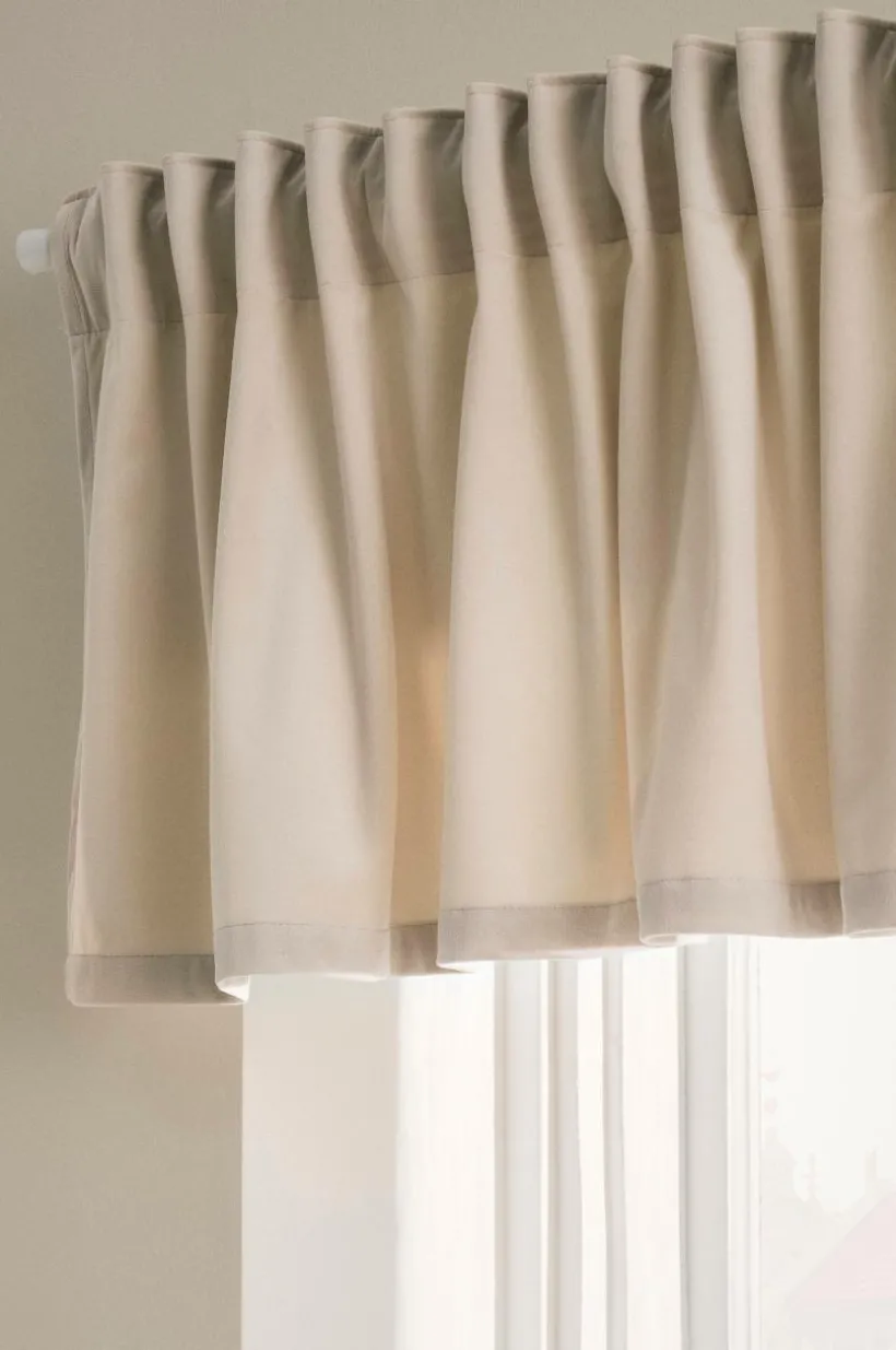 Gardinkappa i enfärgad sammet av polyester. Sammet har fin lyster och mjuk känsla, färgen skimrar vackert i olika ljus. Påsytt multifunktionsband upptill och kappan kan hängas upp med fingerkrokar, kanal samt dold hälla.