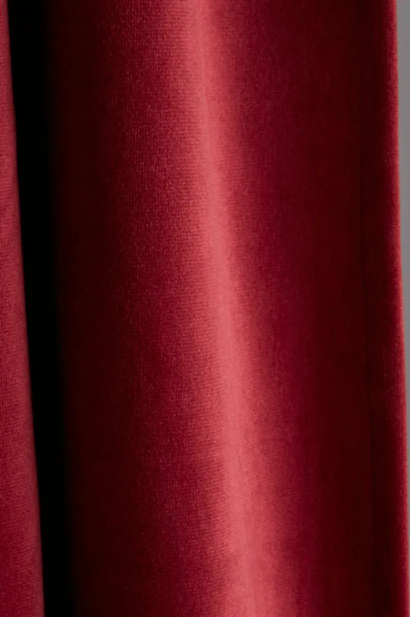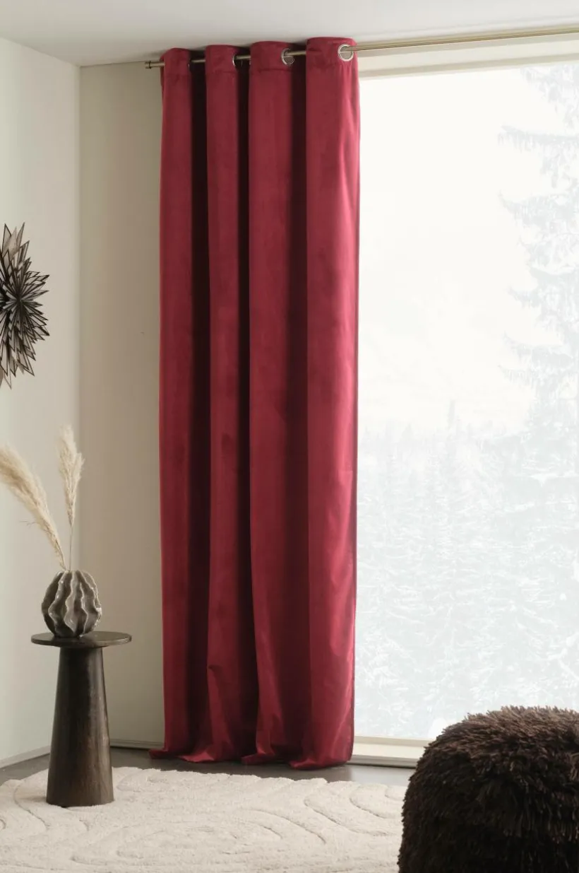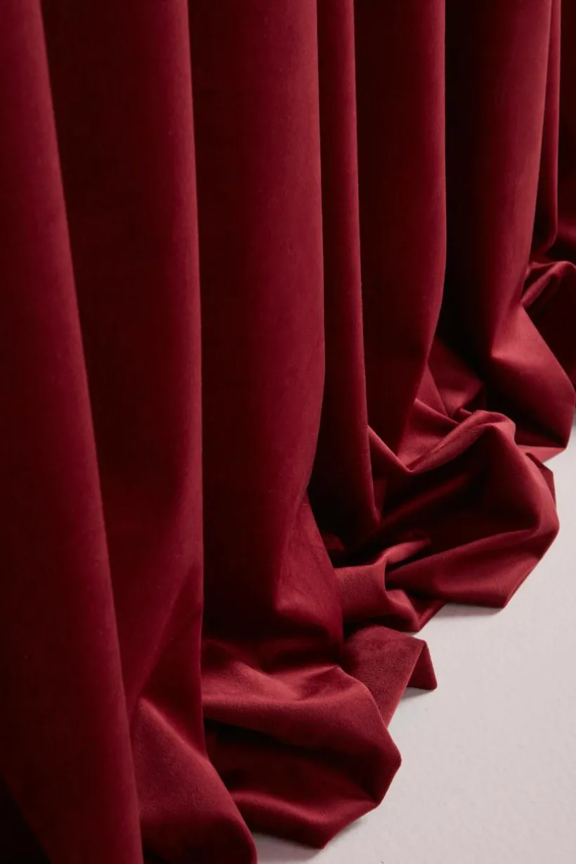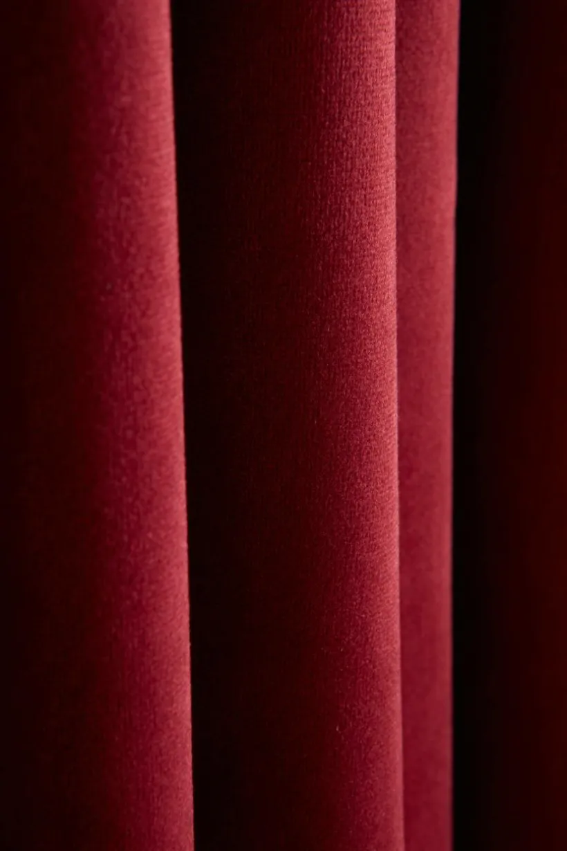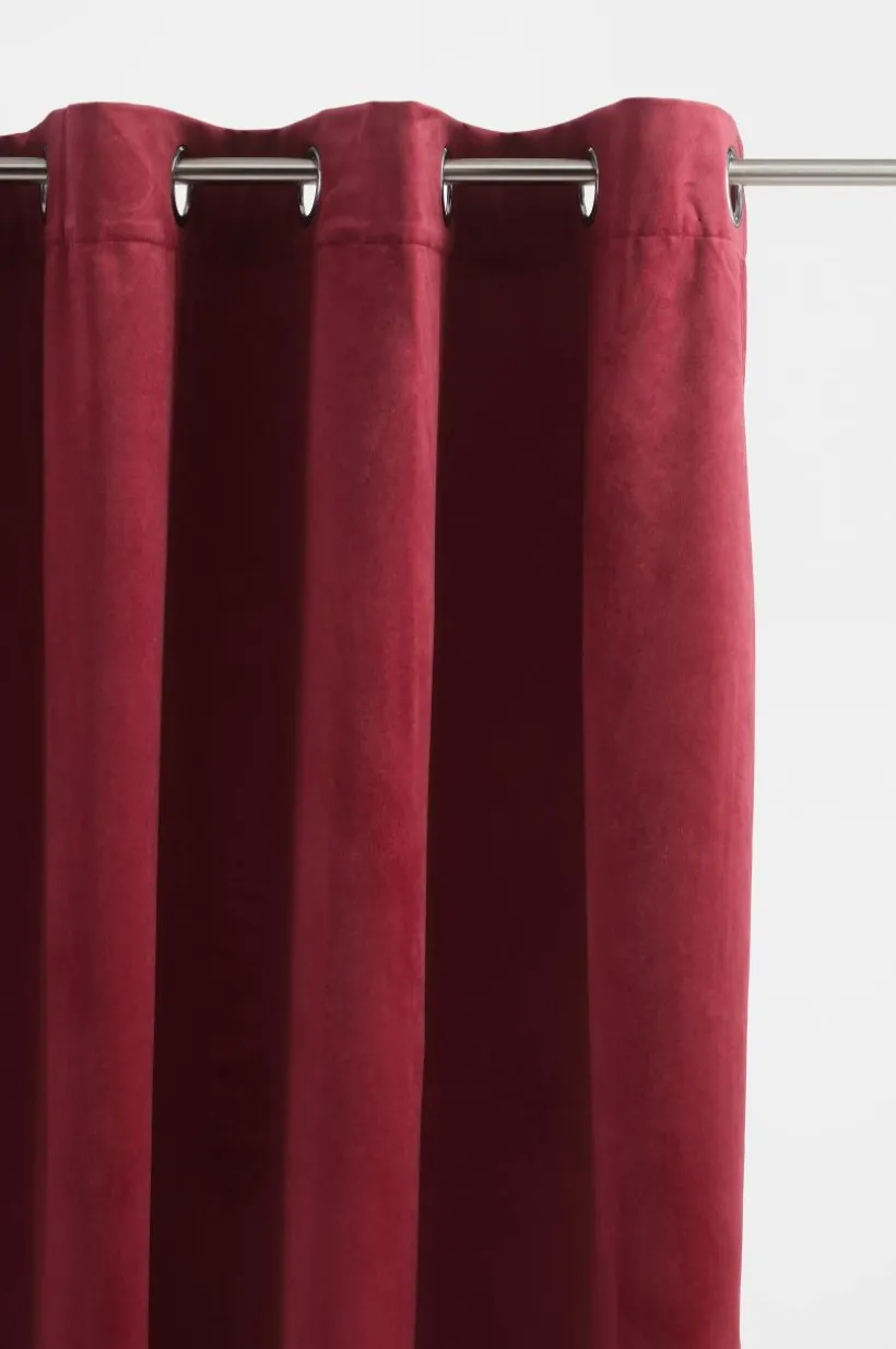 En öljettlängd i enfärgad sammet av polyester. 8 st öljetter per längd. Sammet har fin lyster och mjuk känsla, färgen skimrar vackert i olika ljus.
