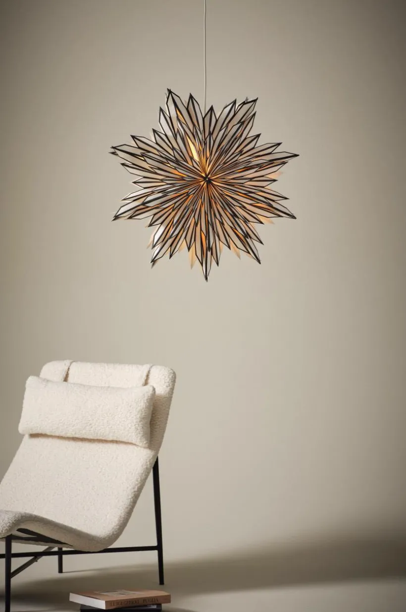 SHAULA julstjärna ger en fängslande snöflinga eller blomformad glans till ditt vardagsrum. Denna strålande ljusdekoration på ø 64 cm är tillverkad med precision och levereras i en vit kartong komplett med en lamphållare, lampskydd och enkla monteringsanvisningar, perfekt för att skapa en festlig atmosfär.
