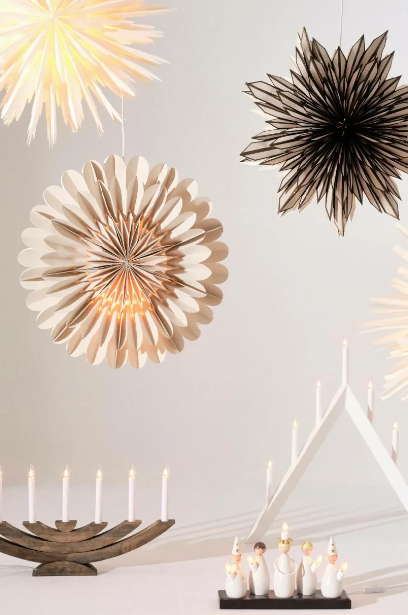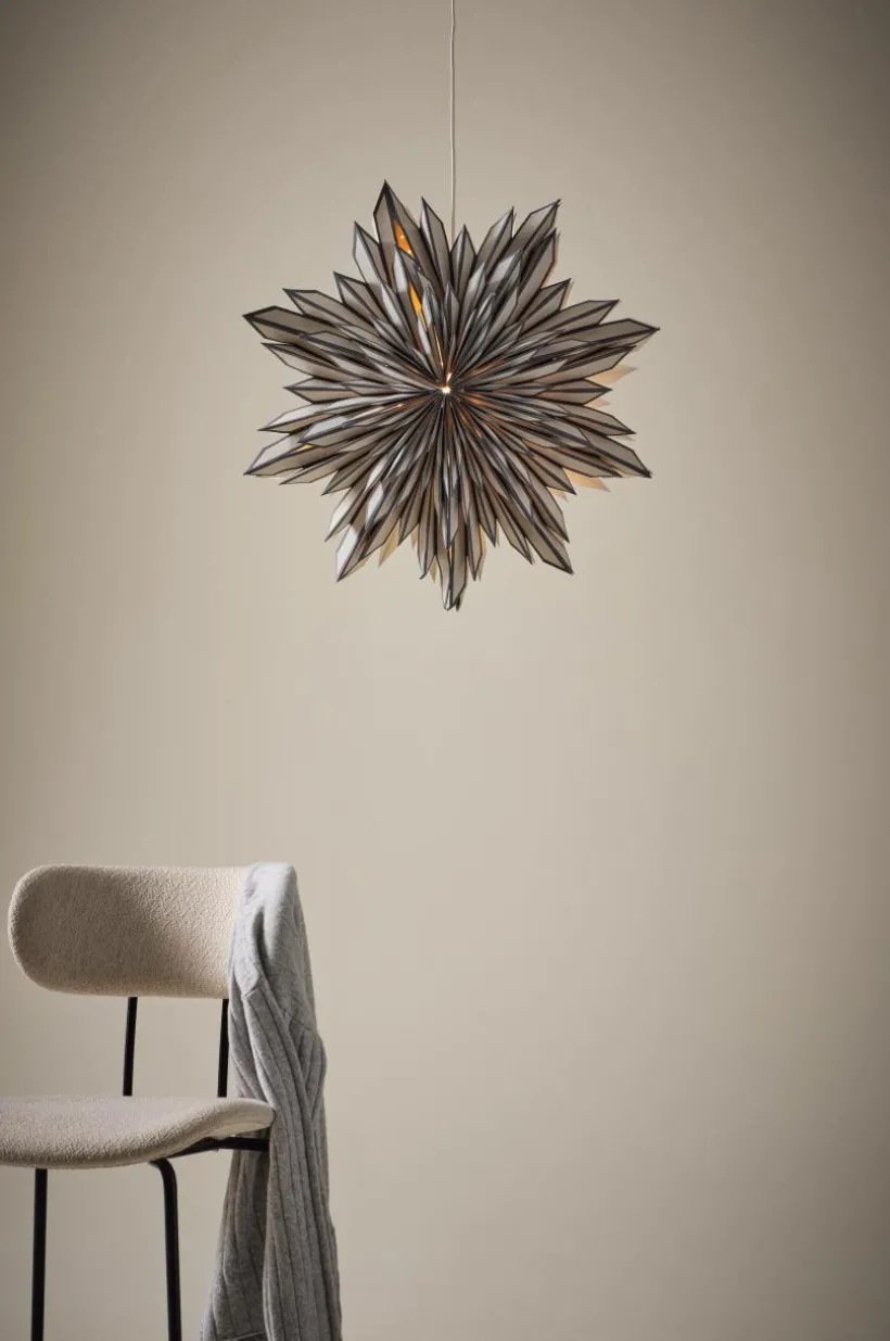 SHAULA julstjärna ger en fängslande snöflinga eller blomformad glans till ditt vardagsrum. Denna strålande ljusdekoration på ø 64 cm är tillverkad med precision och levereras i en vit kartong komplett med en lamphållare, lampskydd och enkla monteringsanvisningar, perfekt för att skapa en festlig atmosfär.