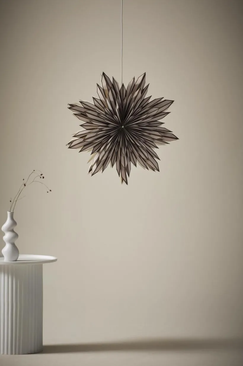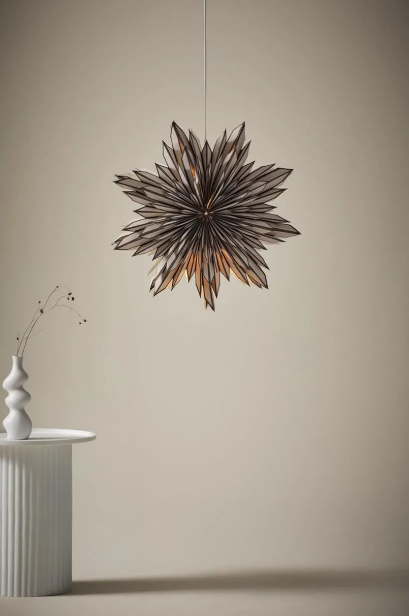 SHAULA julstjärna ger en fängslande snöflinga eller blomformad glans till ditt vardagsrum. Denna strålande ljusdekoration på ø 64 cm är tillverkad med precision och levereras i en vit kartong komplett med en lamphållare, lampskydd och enkla monteringsanvisningar, perfekt för att skapa en festlig atmosfär.
