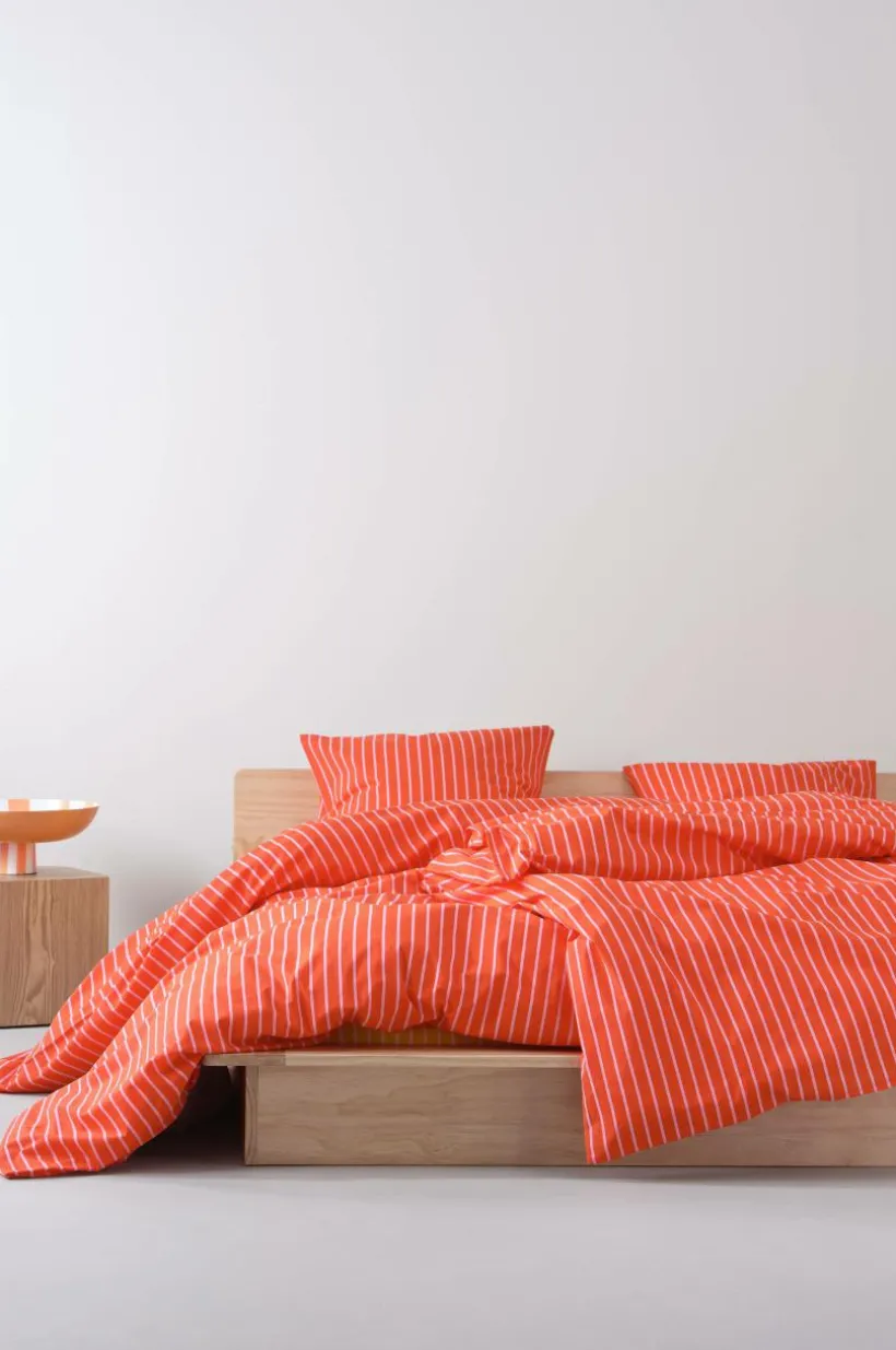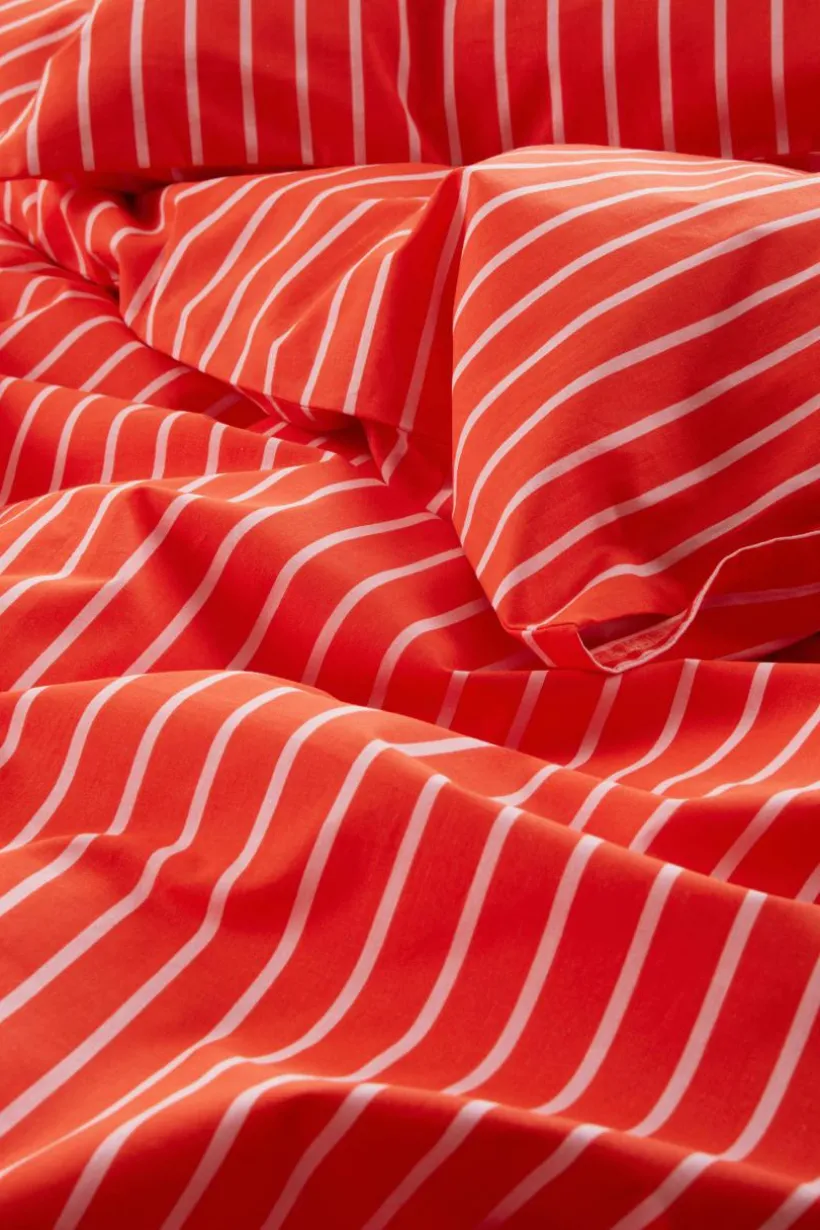 SIMA bäddset tillverkat av ekologisk bomull. Tryckta ränder i krispiga färger. Praktiska handhål för täcket. Förvandla ditt sovrum till en vilsam plats.
