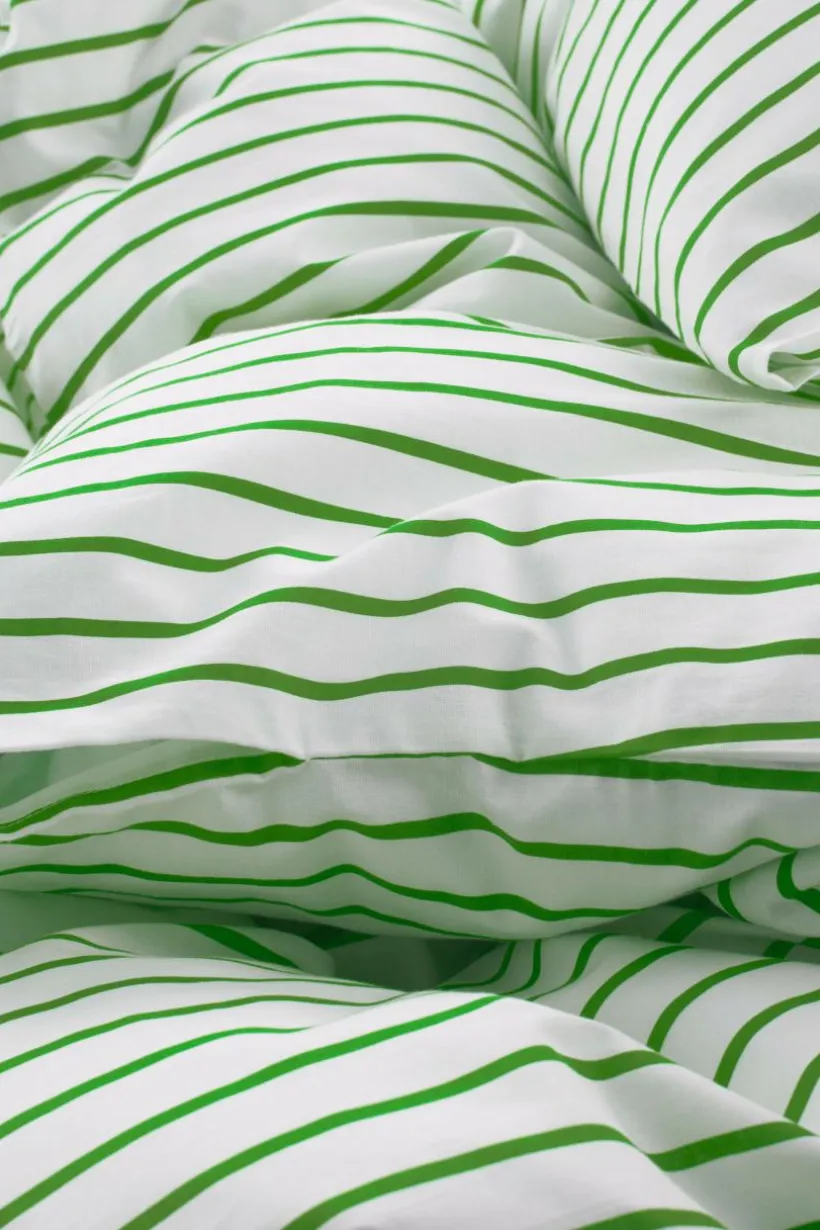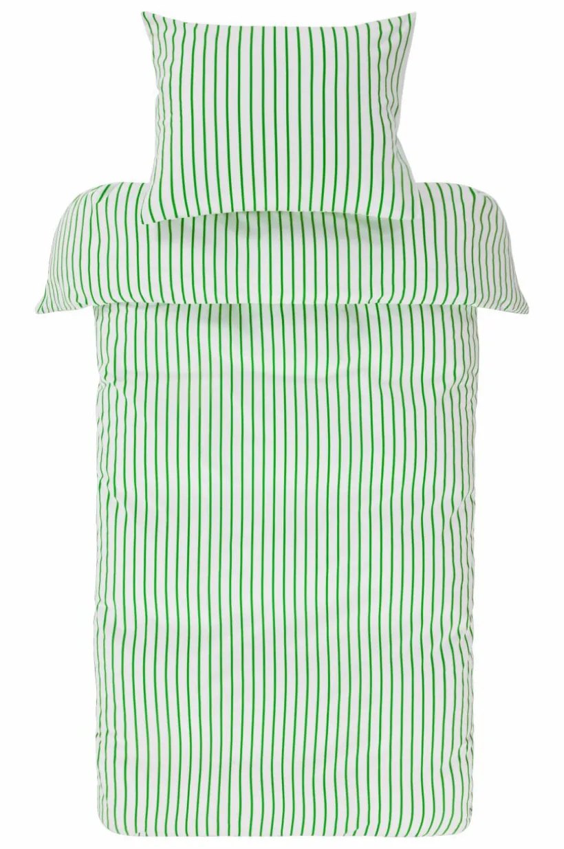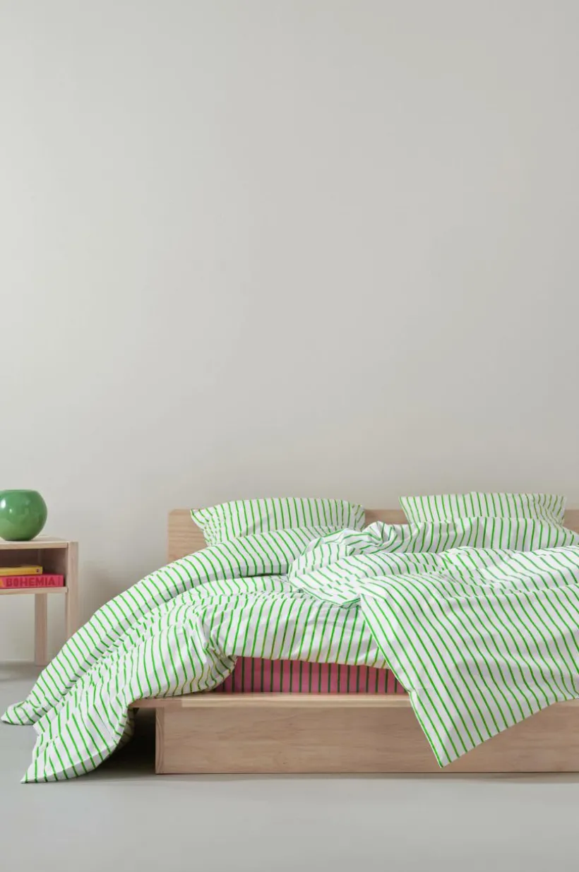 SIMA bäddset tillverkat av ekologisk bomull. Tryckta ränder i krispiga färger. Praktiska handhål för täcket. Förvandla ditt sovrum till en vilsam plats.