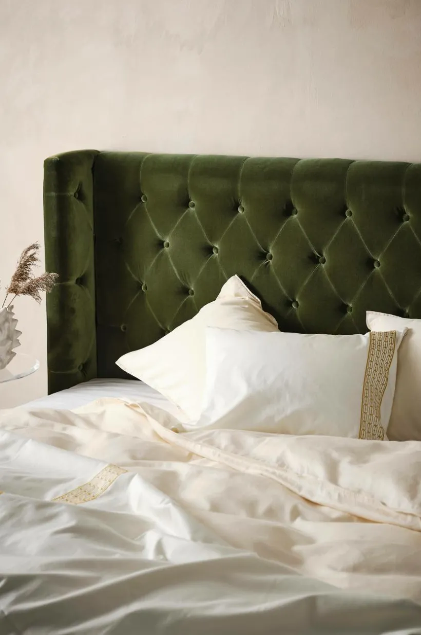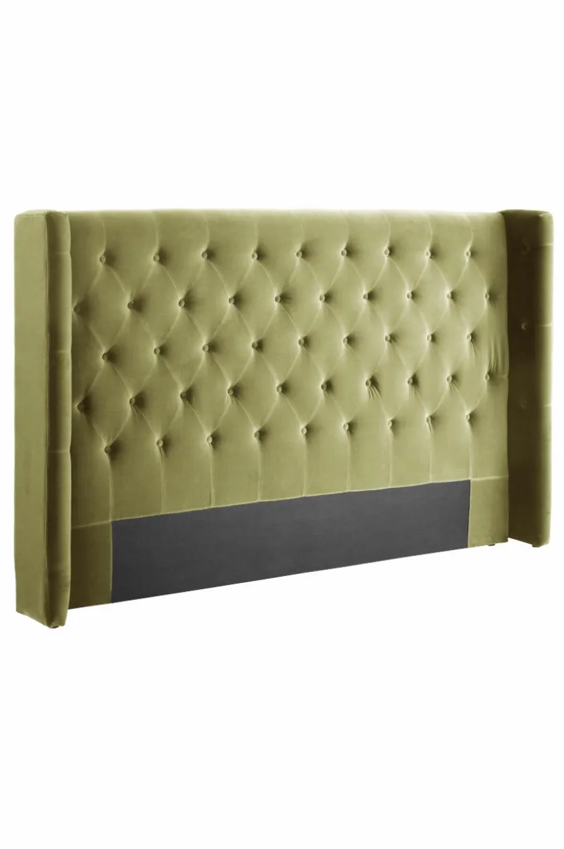 Fristående gavel klädd med sammet och djuphäftade klädda knappar. Går även att hänga upp på väggen. Du skapar en lyxig hotellkänsla hemma med en djuphäftad sänggavel med vingar. Allt i finaste sammet av bomullsmix.