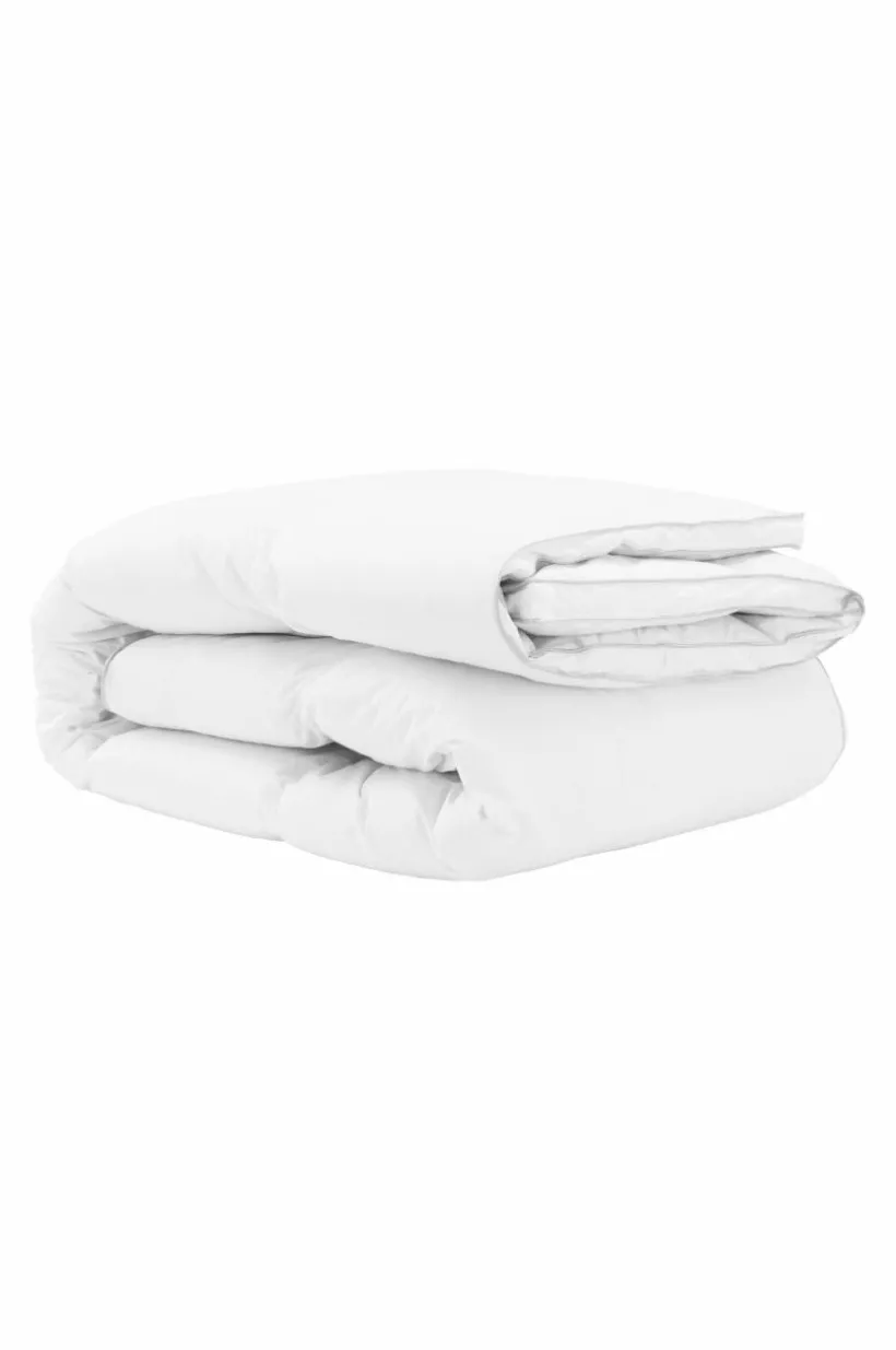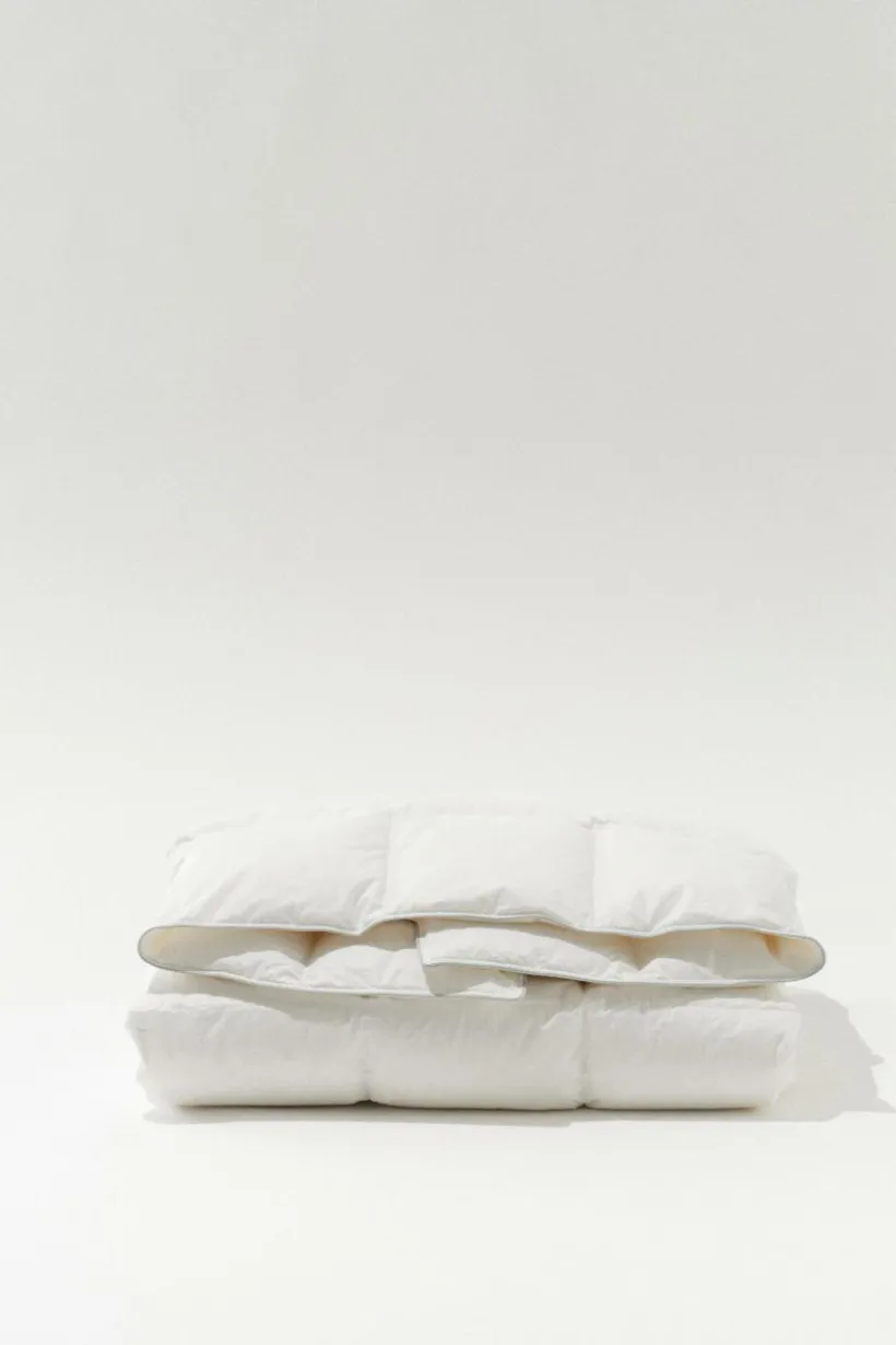 Det vita yttertyget är av tät bomull som inte läcker dun och har två silvergrå passpoalkanter runt om. Duntäcket levereras i en tygväska av bomull. .
