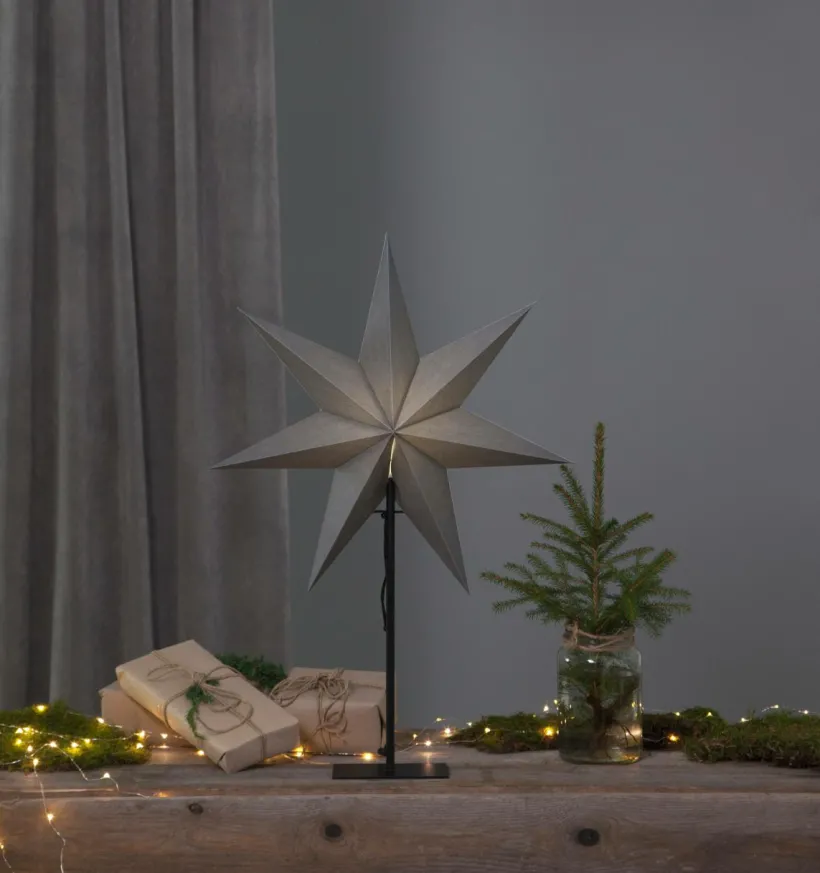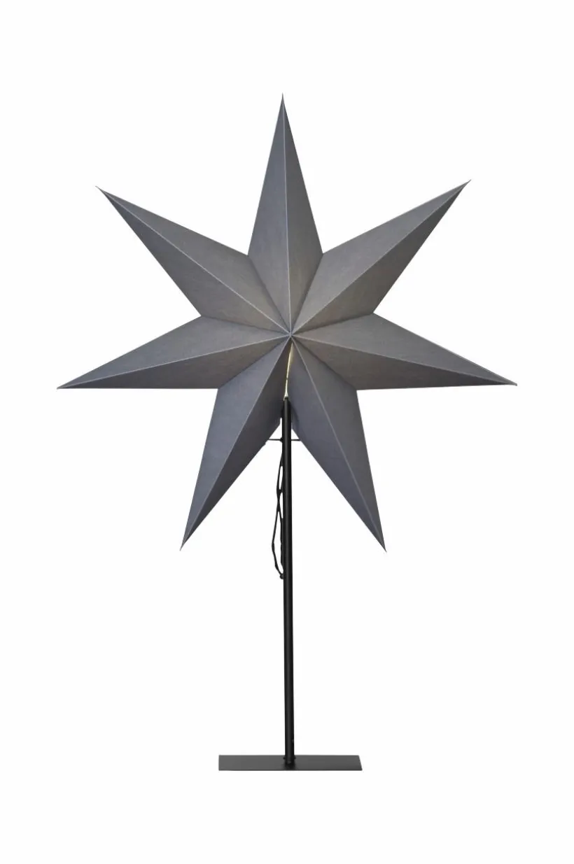 Stjärna på fot med svart textilkabel. Elegant stjärna att dekorera med i hemmet. Stjärnan har plats för en ljuskälla. Höjden är 75cm, bredd 55 cm, djup 15 cm. Sockel E14. Max 25 W. Sladdlängd 180 cm.