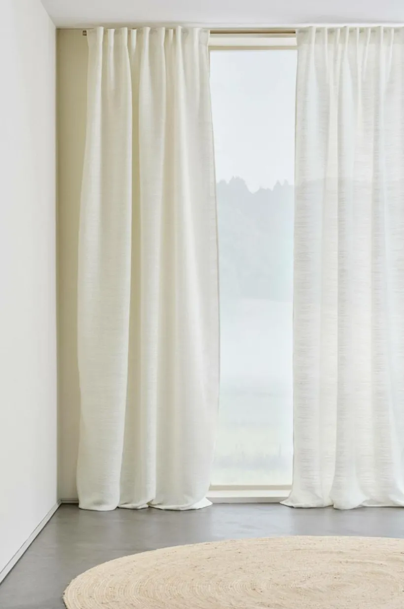 Två gardinlängder i ett vackert tyg där trådar i olika tjocklek och kvalité vävts så att ett livfullt mönster skapas. Gardinerna har ett klassiskt och fräscht uttryck och passar in i många olika stilar. TESS har påsytt multifunktionsband och gardinen kan hängas upp med fingerkrokar, kanal samt dold hälla. Tygets gramvikt 240 g/m².