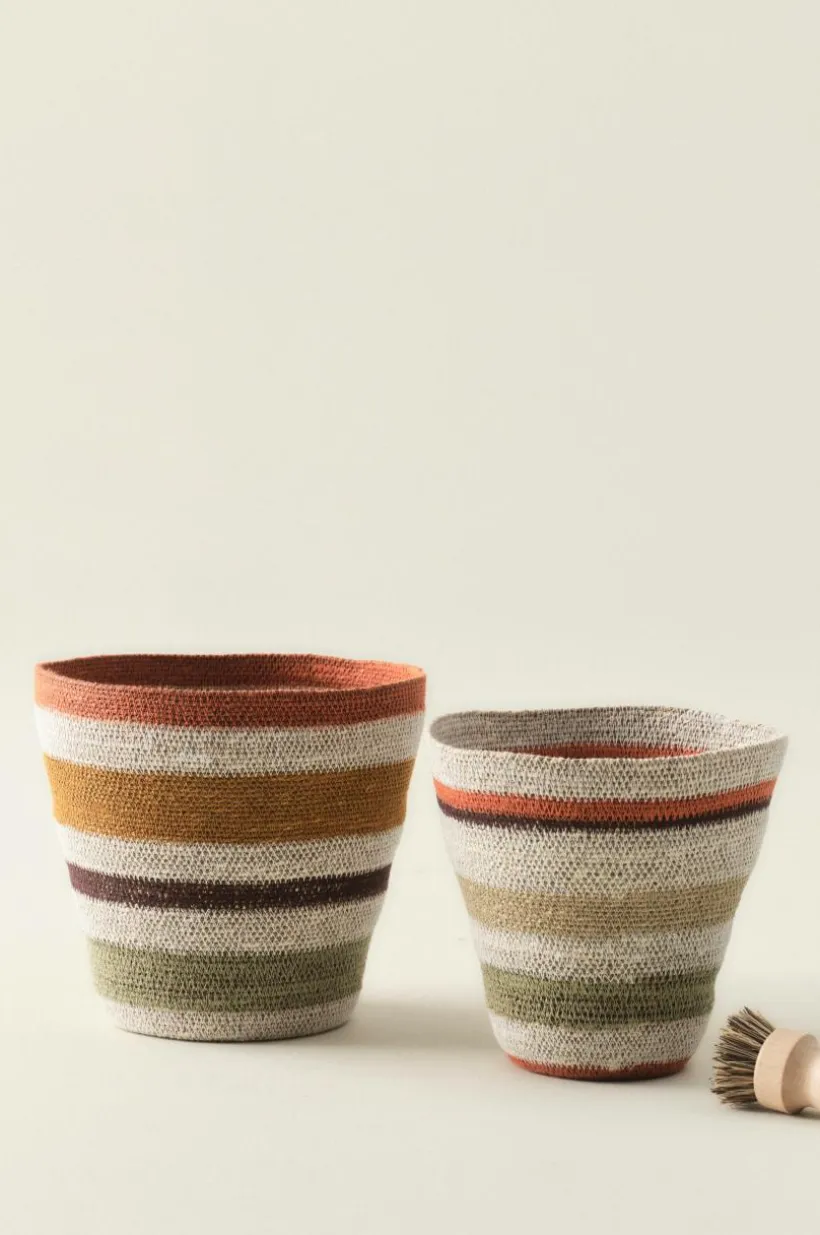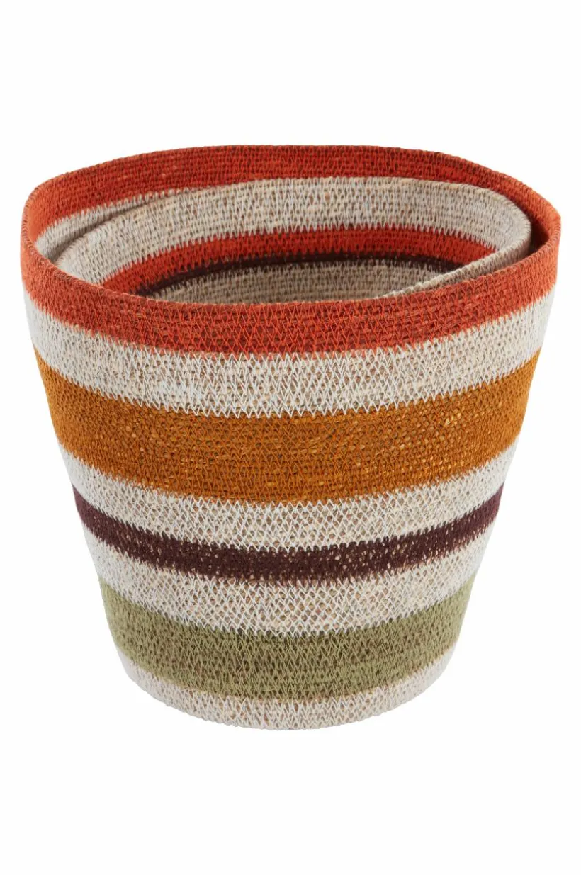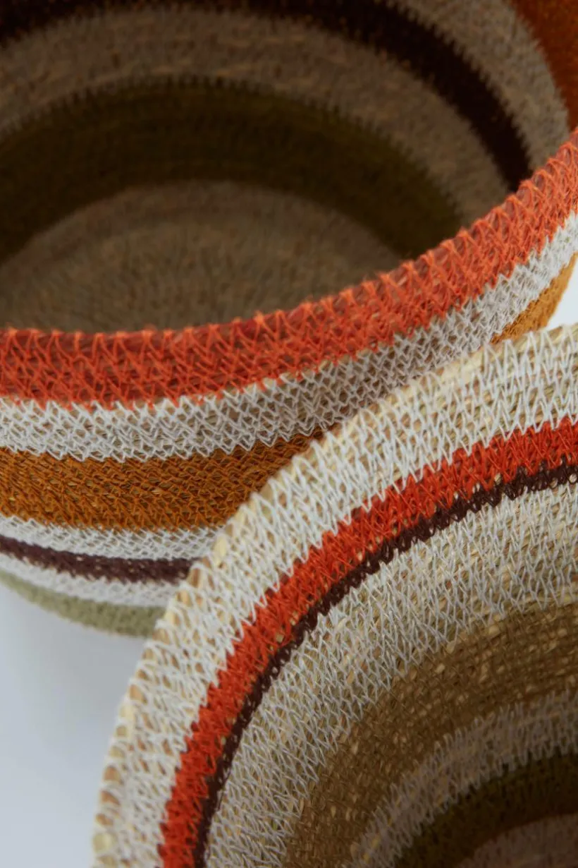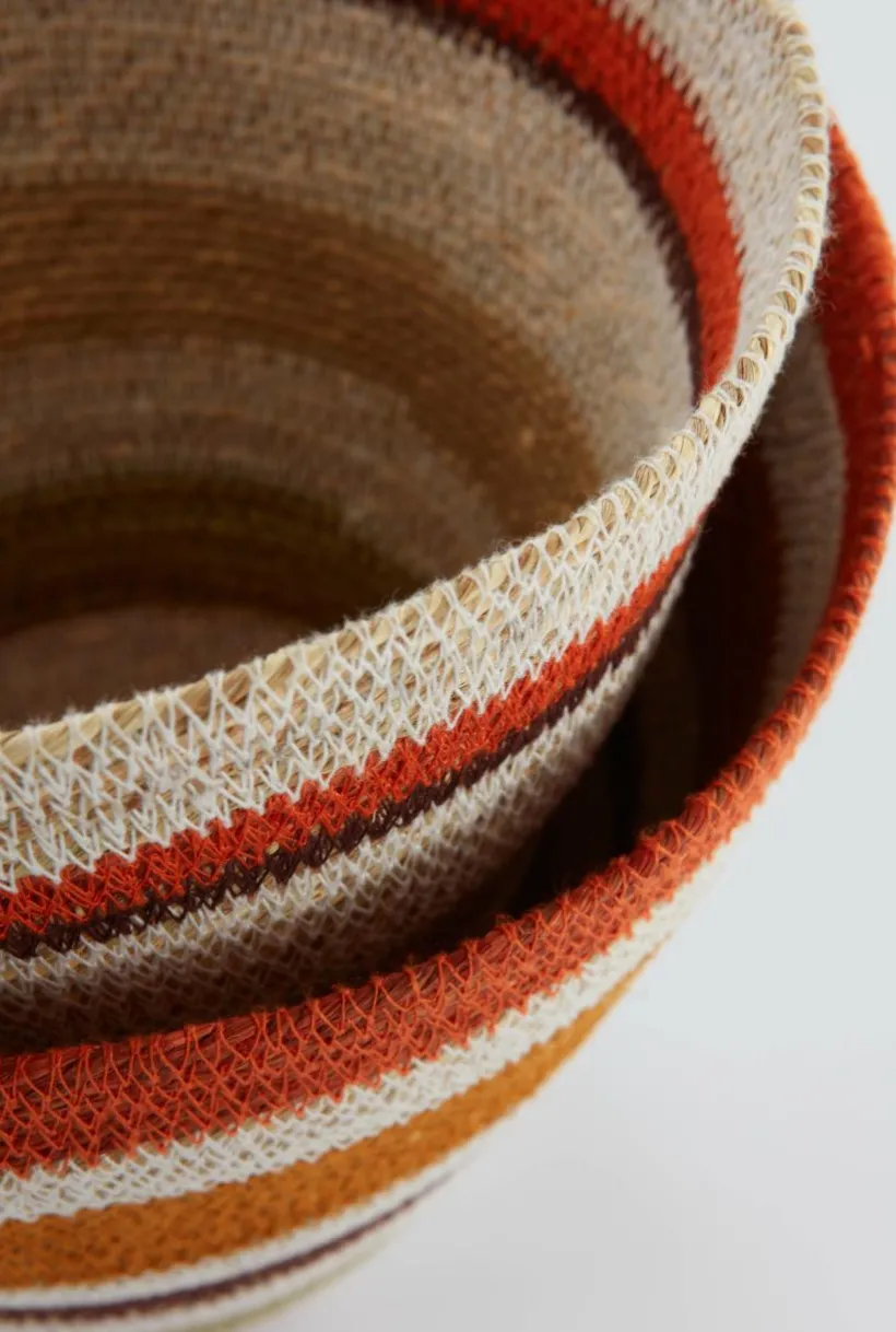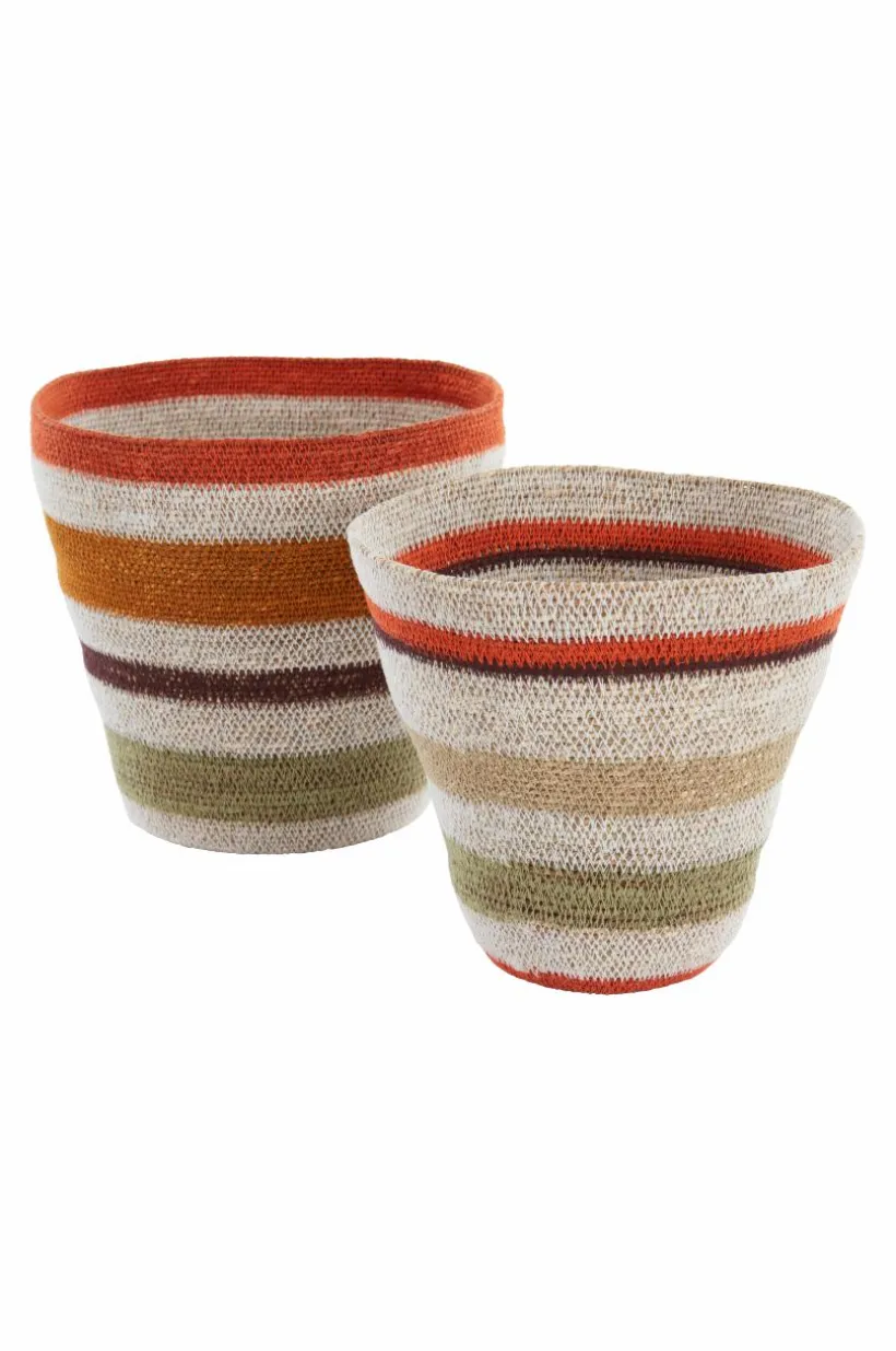Två runda korgar som är flätade av sjögräs. Bottenfärgen är sjögräsets naturliga färg och ränderna är färgade. Sjögräs är ett naturmaterial med färgvariationer beroende på var och hur plantan växt, vilket gör varje korg unik. Du får två olika storlekar i denna förpackning.
