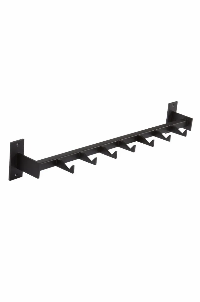 Hängare av mattsvart metall. Hängaren har sju kantiga krokar där frottén, plaggen och väskorna hänger kvar tack vare formen.