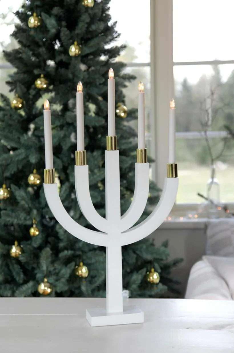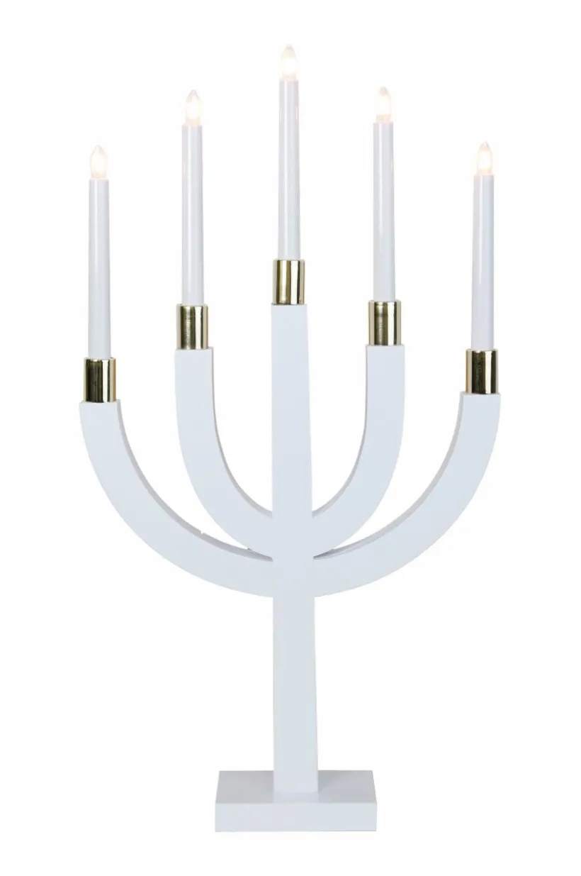 Ljusstake av trä och metall med 5 ljus. Höjd 67 cm, bredd 35 cm, djup 8 cm. Sladd med strömbrytare, sladdlängd 1,8 m. Sockel E10, lampor medföljer. Ljusmanschett köpes separat och ingår ej.