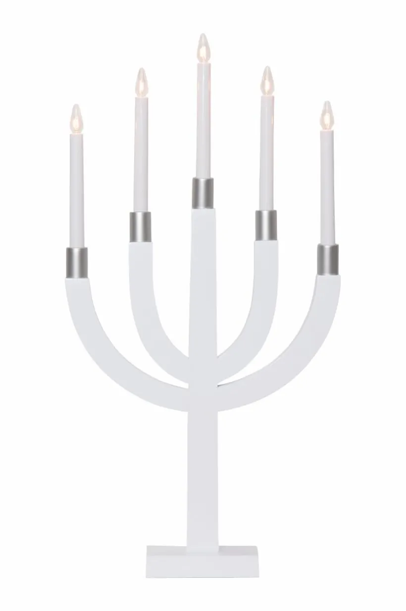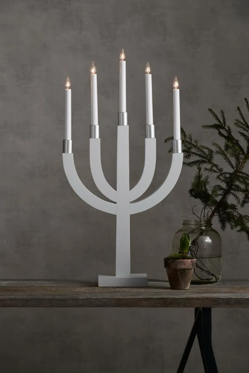 Ljusstake av trä och metall med 5 ljus. Höjd 67 cm, bredd 35 cm, djup 8 cm. Sladd med strömbrytare, sladdlängd 1,8 m. Sockel E10, lampor medföljer. Ljusmanschett köpes separat och ingår ej.
