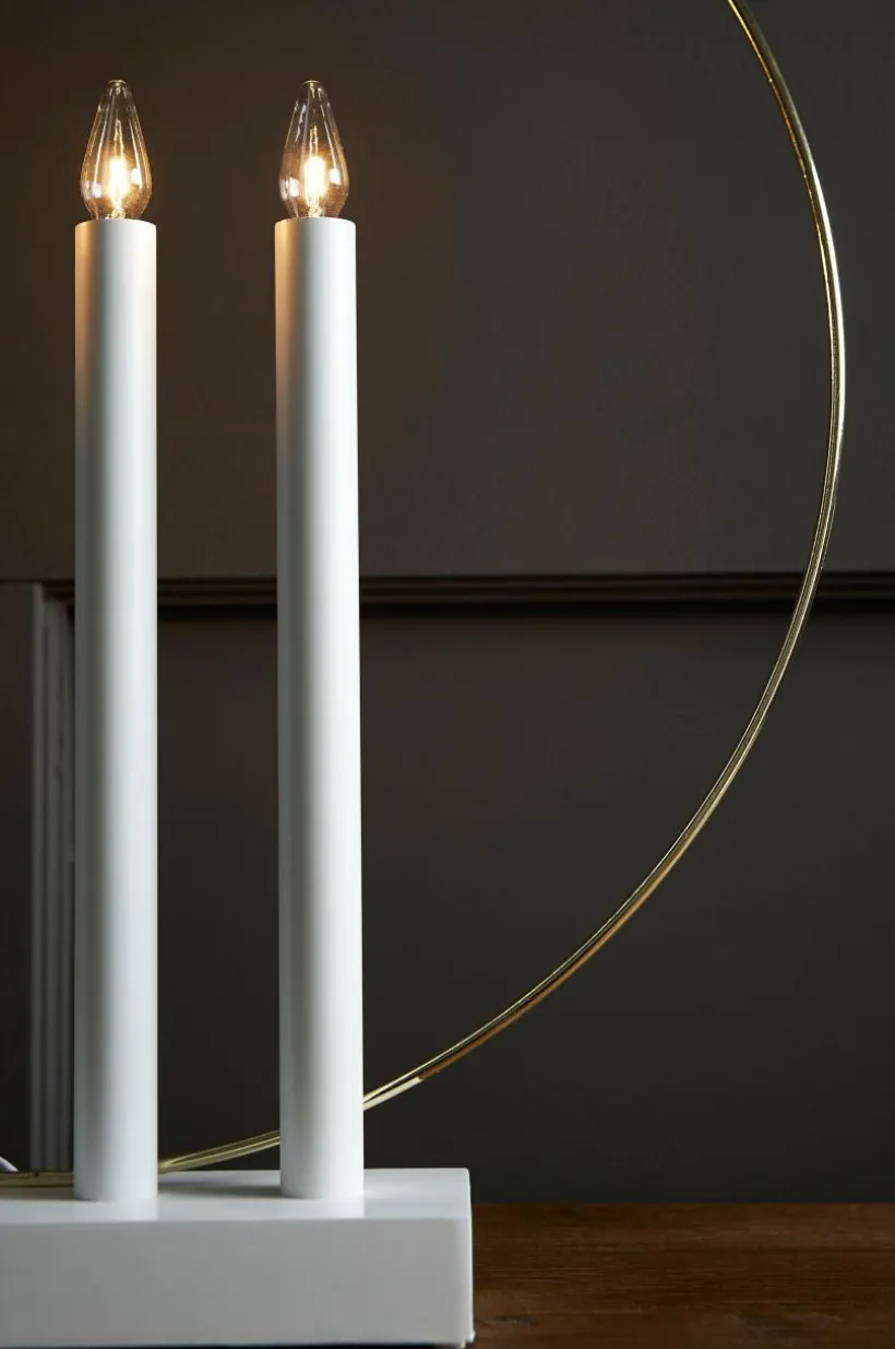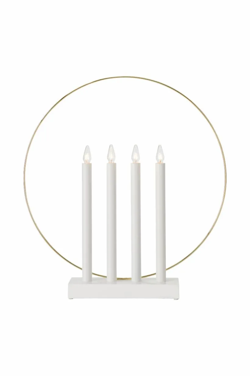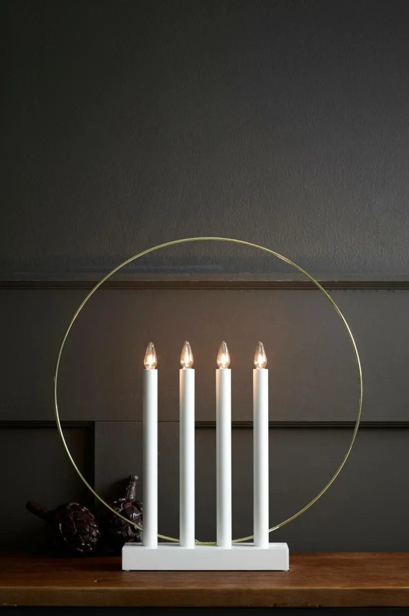 Ljusstake av trä och metall med 4 ljus. Höjd 42 cm, bredd 45 cm, djup 8 cm. Sladd med strömbrytare, sladdlängd 1,8 m. Lampor medföljer.