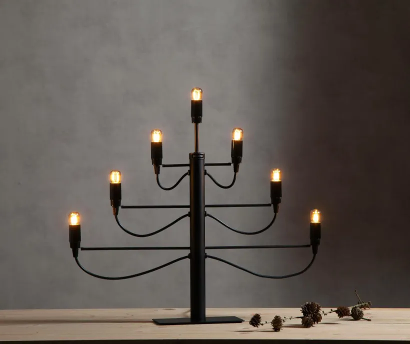 Trendig ljusstake, Milano, med plats för 7 stycken E14 lampor Höjd 55 cm. Djup 10 cm. Bredd 60 cm. Anslutningskabel 1,8 m med brytare. Ljuskällor ingår ej.