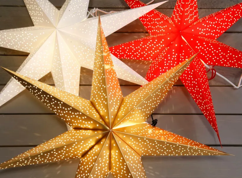Hängande stjärna i guldigt papper. Höjd 70 cm. Djup 16 cm. Bredd 70 cm. Anslutningskabel 3,5 m. E14 sockel. Ljuskälla ingår ej.