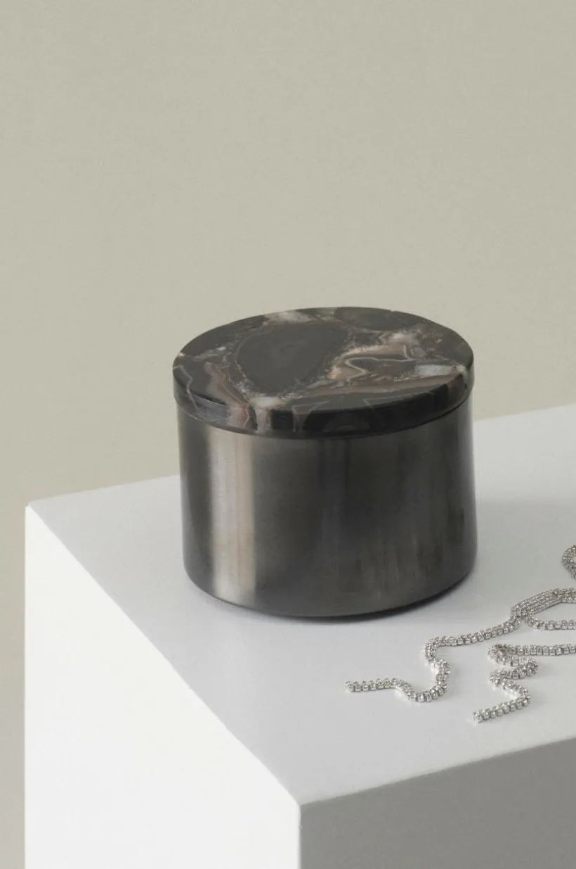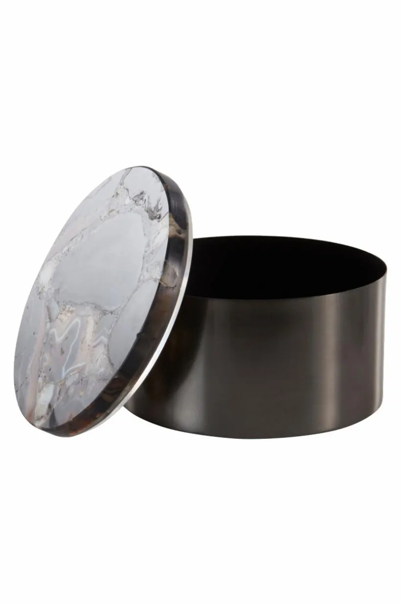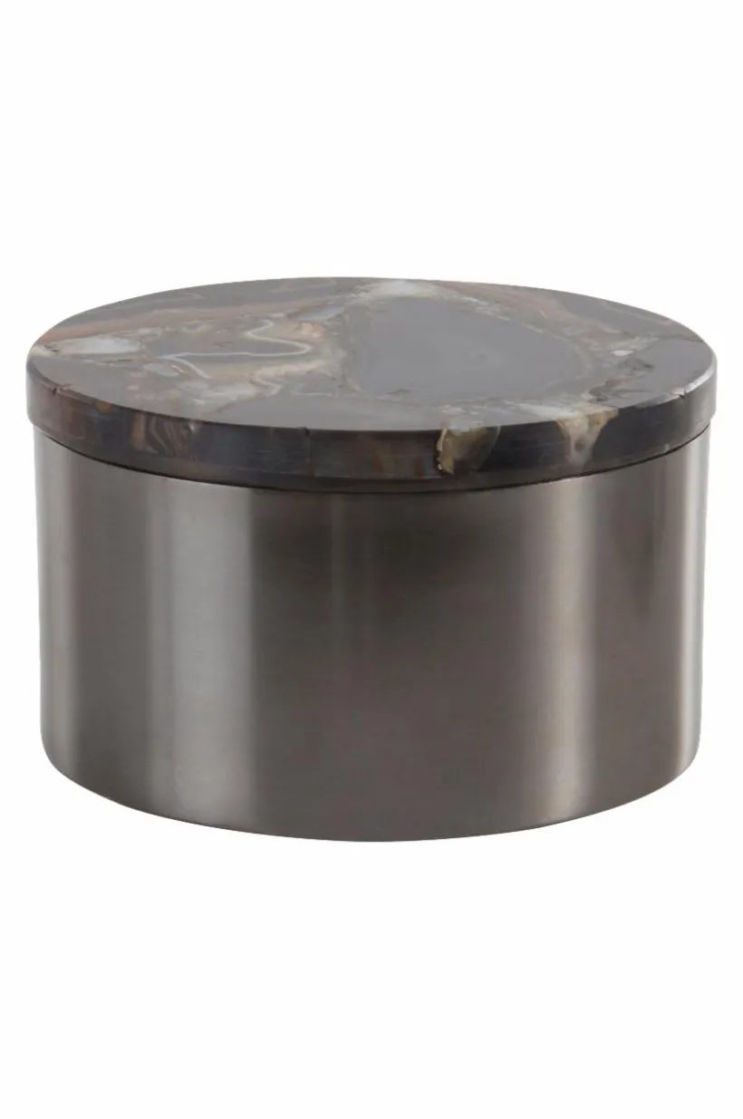 Elegant dekorationsask med lock. Locket är av agat som är en ädelsten med vackert, marmorerat mönster. Asken är av rostfritt stål.