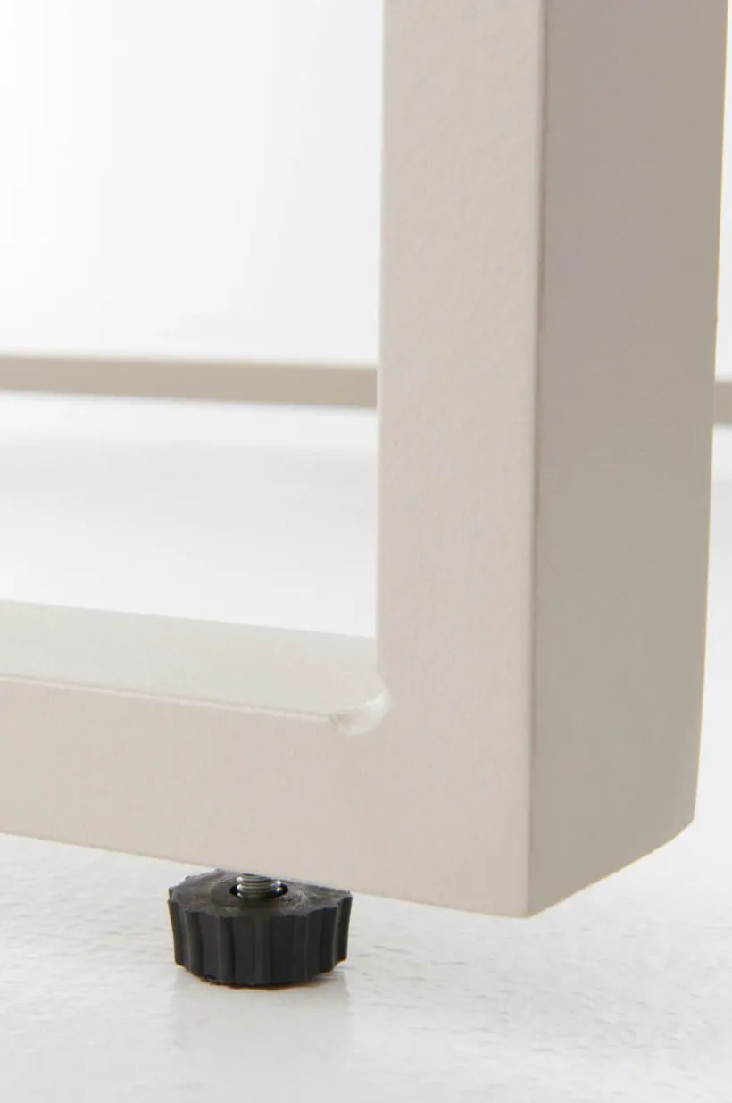 Lågt soffbord med skön loungekänsla. Att inreda altanen som en härlig soffhörna är en trend som växer starkt. ALASSIO är i aluminium så du kan ha det utomhus utan att det rostar och det är lätt att torka av innan du serverar något gott. En finess är att bordet har ställbara fötter så även om underlaget är lite ojämnt står bordet stabilt och bra.