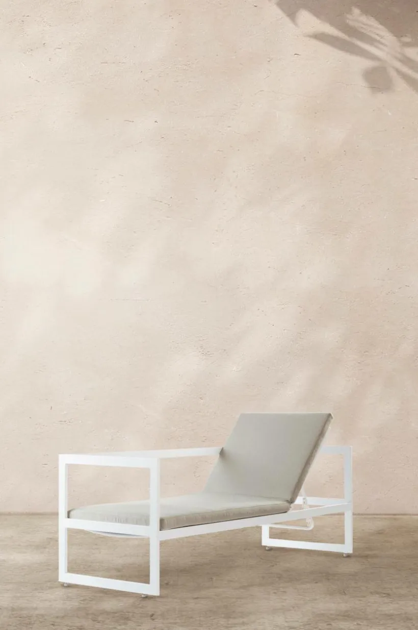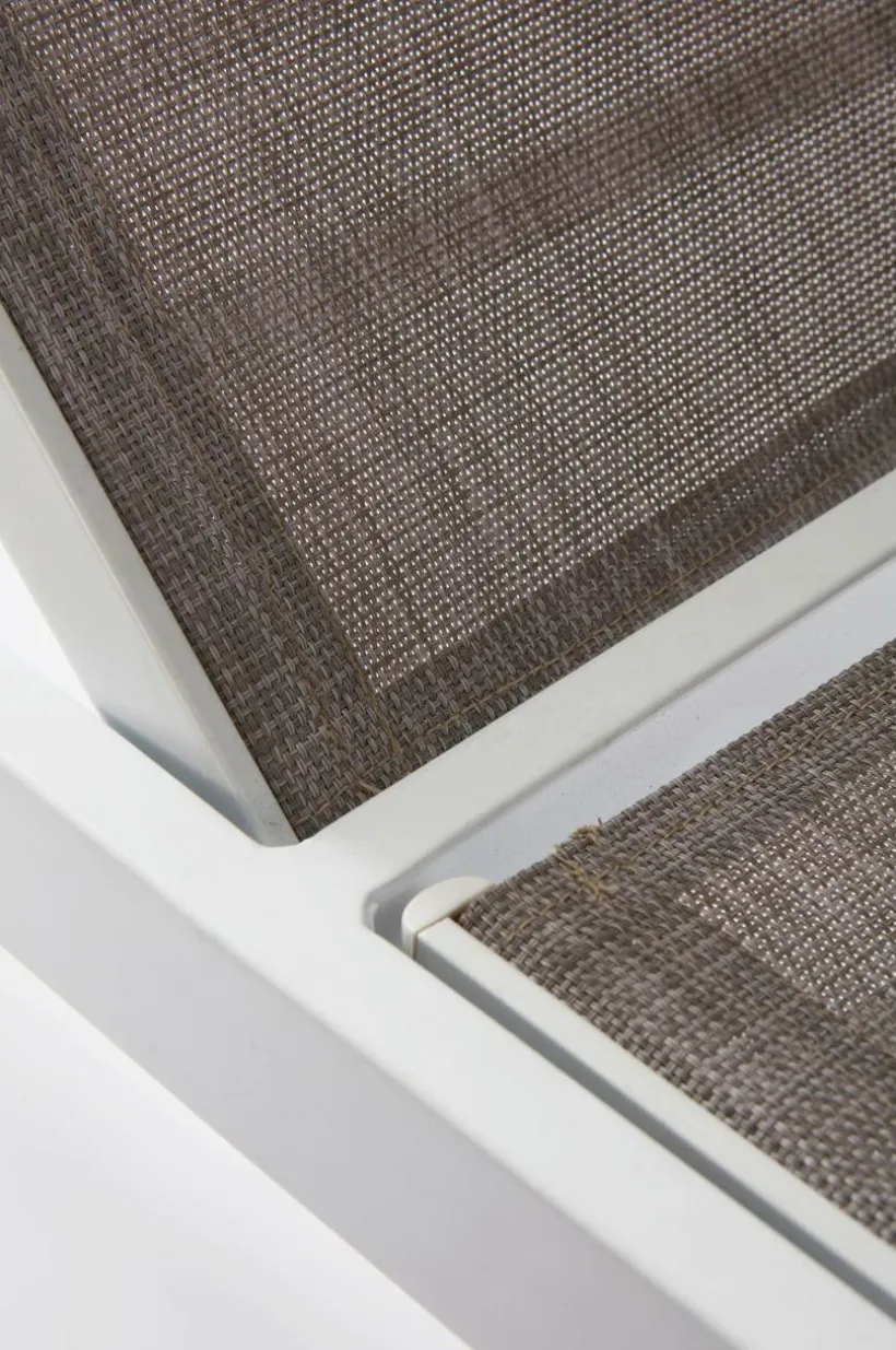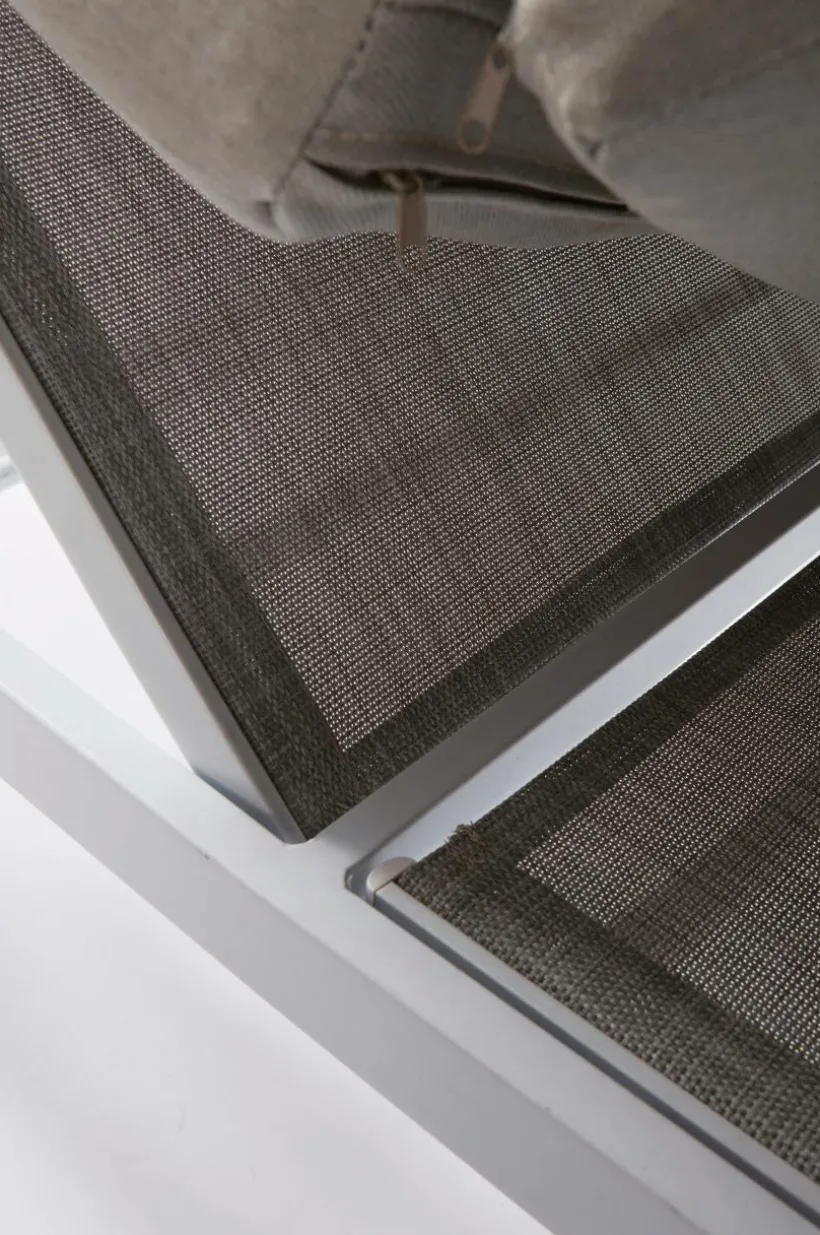 Solsäng eller utesoffa av pulverlackerad aluminium. Botten är av kraftig väv. Ryggdelen på solsängen är ställbar i 5 lägen. Madrassen har yttertyg av polyester med slubeffekt och foam av skumplastgummi. Får du bara plats med en möbel på balkongen så tipsar vi dig om att välja ALASSIO. En solsäng med ställbar rygg som också är en soffa för dina vänner. Dynan som hör till är snygg och bekväm. Denna varianten har ryggstödet till höger när du ligger mot den ställbara delen.