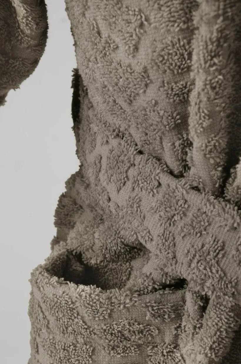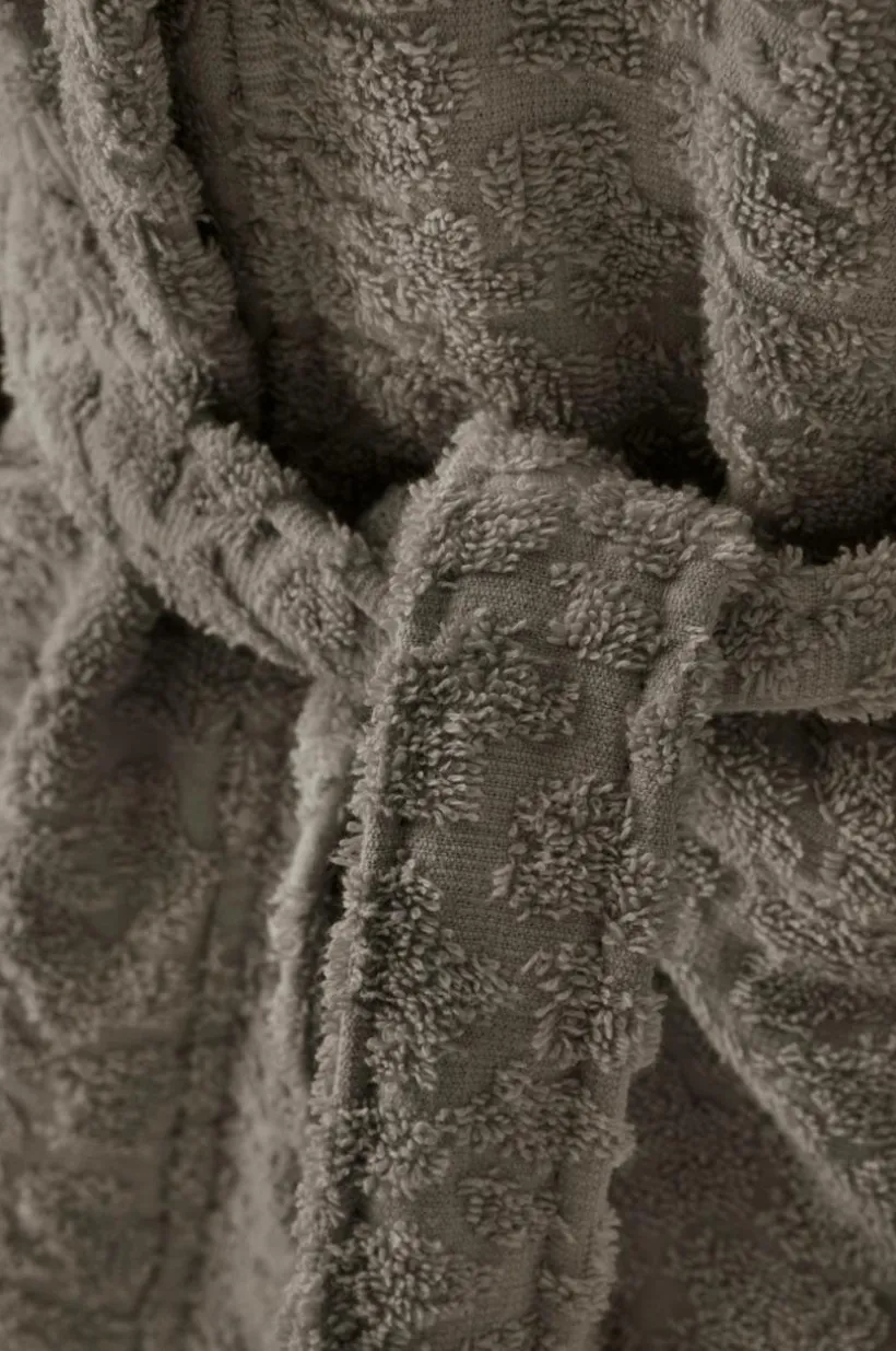Badrock i härligt mjuk, enfärgad, ekologisk bomullsfrotté med jacquardvävt strukturmönster ton i ton på ena sidan och slät frotté på den andra. Mysig modell med huva, två fickor och knytskärp. ALESSIO är en serie med riktigt mysig frotté som finns i mjuka färger och många olika delar. Frottén är av lyxig kvalité med hög gramvikt, 450 g/m². Finns i storlek 98/104 cl – längd 70 cm mitt bak och 122/128 cl – längd 86 cm mitt bak.