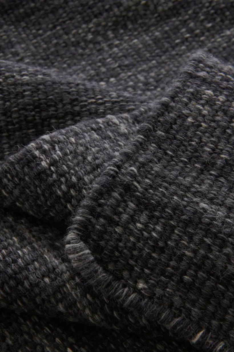 Handvävd matta av ull och polyester med varp av bomull och nylon. Den fina kvalitén gör att mattan ger ett naturligt intryck. 1400 g/m².