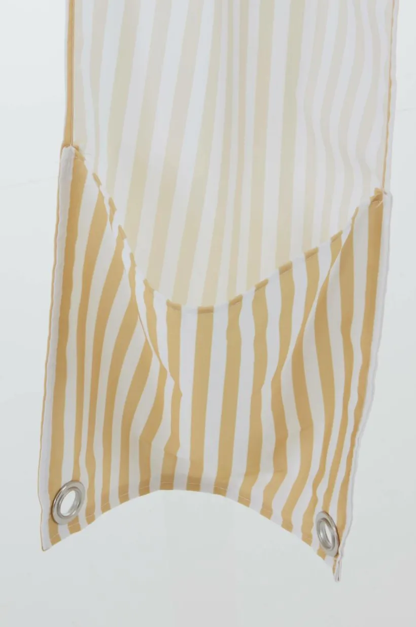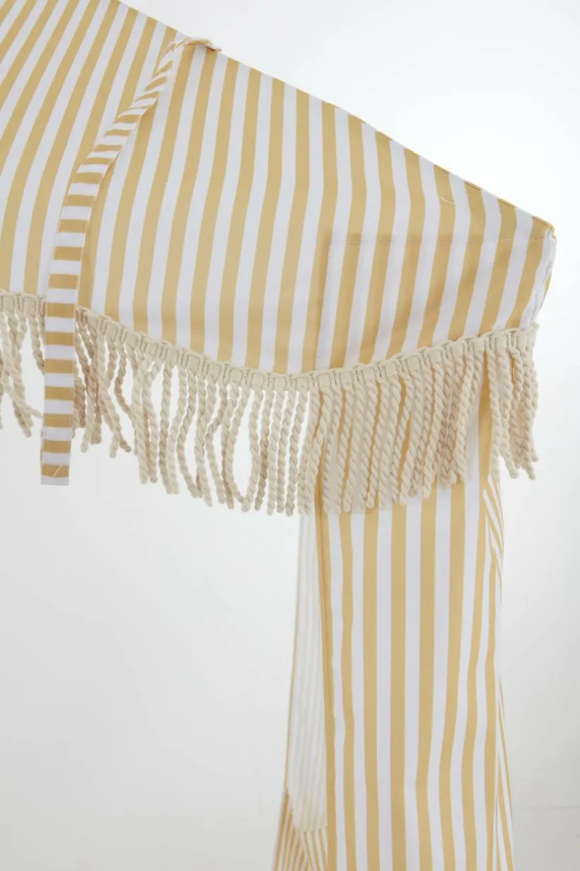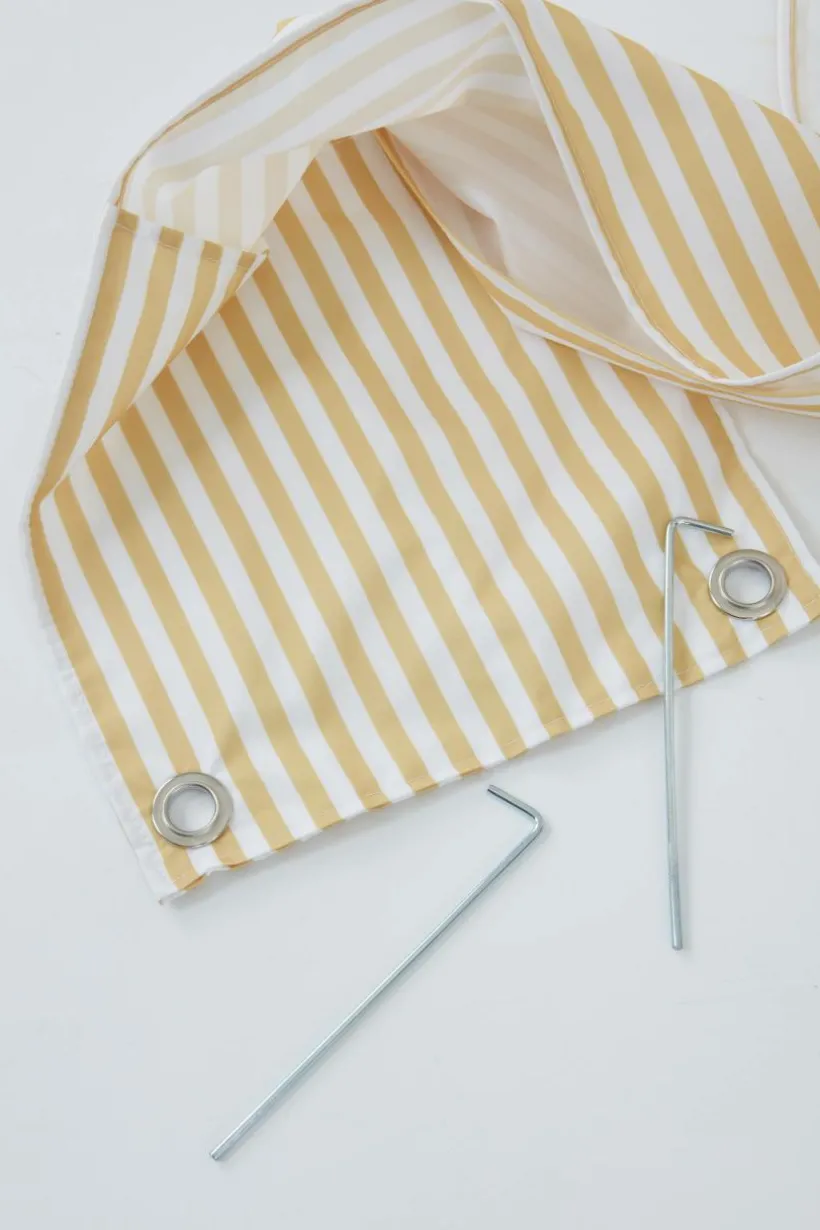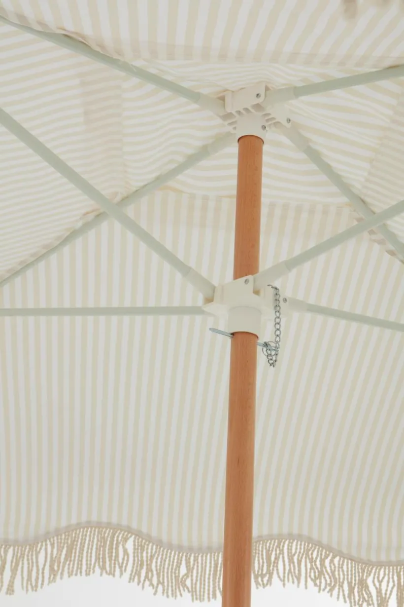 ALMEDA är ett randigt strandtält av trä med vattenavvisande tyg av polyester och frans av polyester/bomull. Stången i mitten är av trä. Tältet ger behaglig skugga på stranden eller i trädgården. Parasollskruv medföljer att förankra parasollet i marken/sanden.