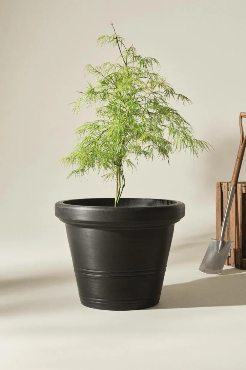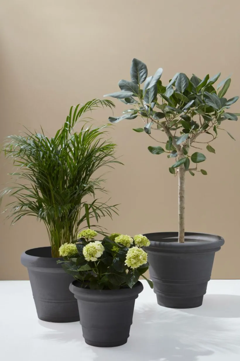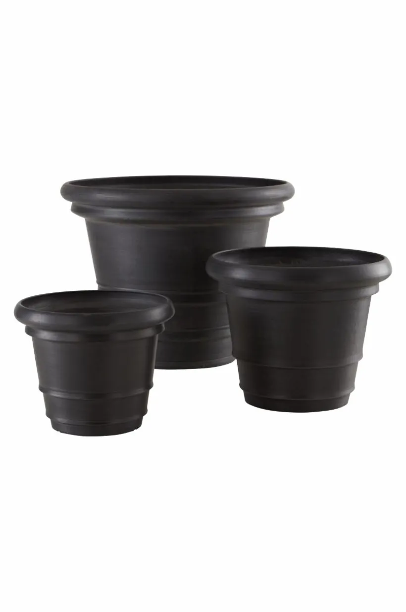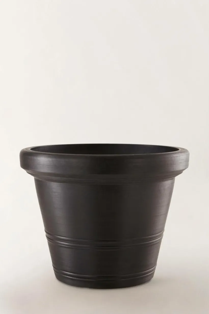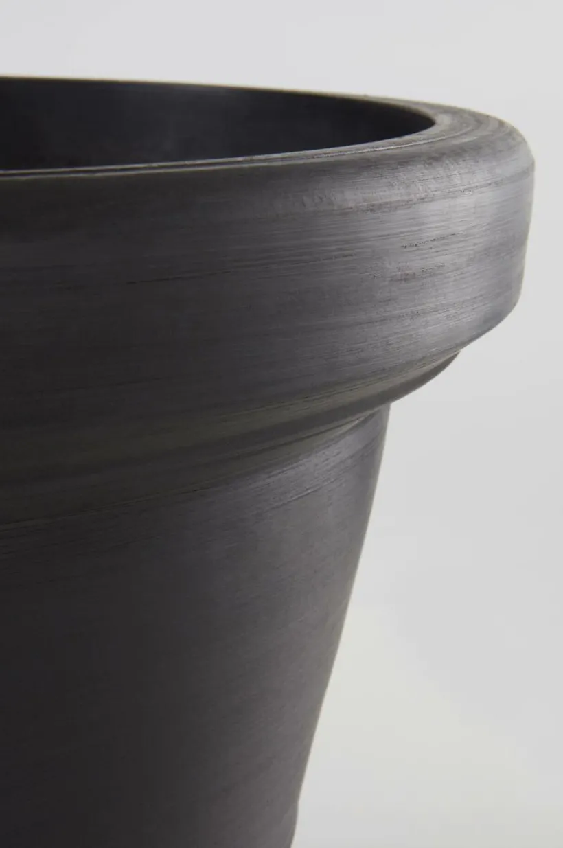 AMY är en utomhuskruka som har formen av en klassisk lerkruka, men är tillverkad av återvunnet kompositmaterial. Fördelen med materialet är att krukan är lätt att hantera, den är tålig och väger en bråkdel av en ler- eller stenkruka. Den traditionellt formade krukan har hel botten med en stansad plugg som du kan trycka ut om du vill ha hål för dränering i botten. Krukan fungerar förstås lika bra inomhus.