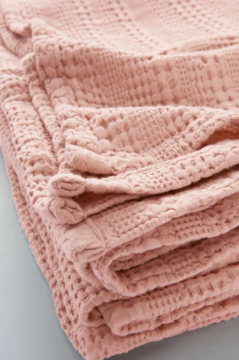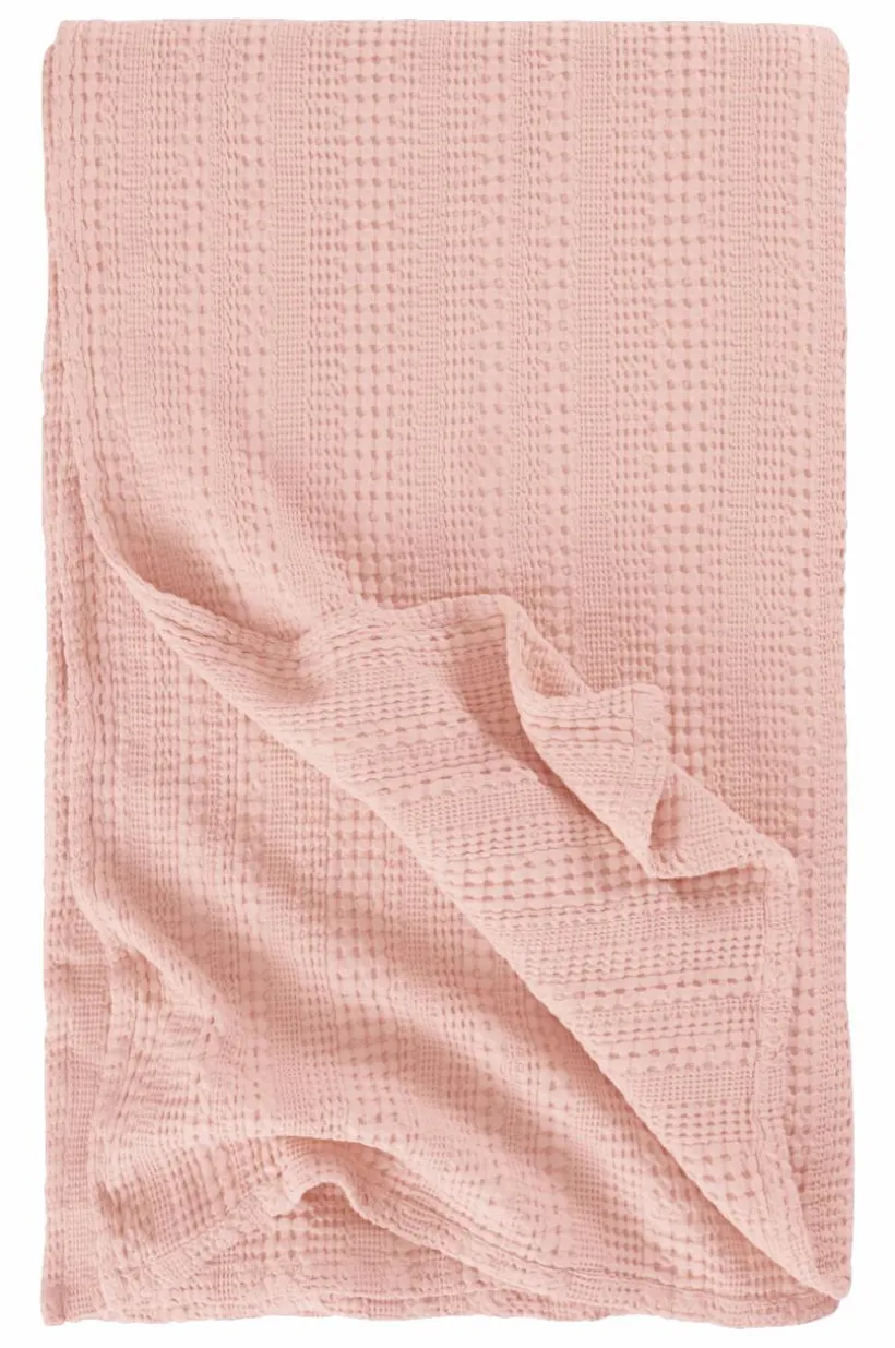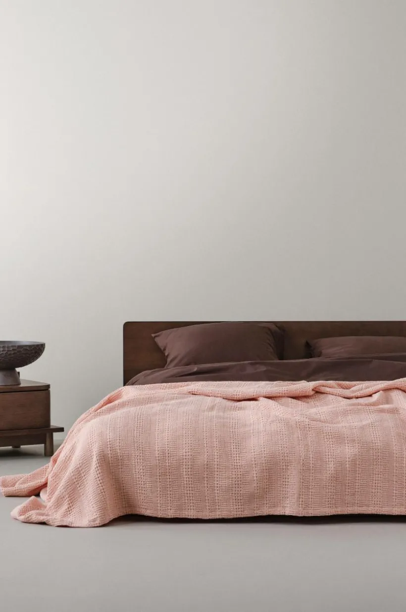 Överkast i härligt mjuk och lätt bomull med mixat våffelmönster som ger fint randmönster. Överkastet passar till enkelsäng och är plaggtvättat vilket innebär att det tvättats efter sömnad för att bli extra mjukt och följsamt. Ett lite bubbligt och livfullt överkast är lika fint när sängen är bäddad som när det ligger löst och ledigt över fotänden på sängen eller får vara pläd på soffans armstöd.
