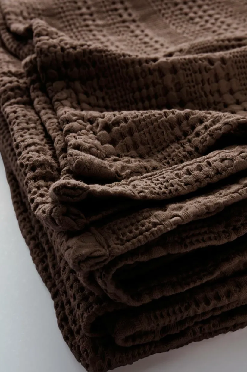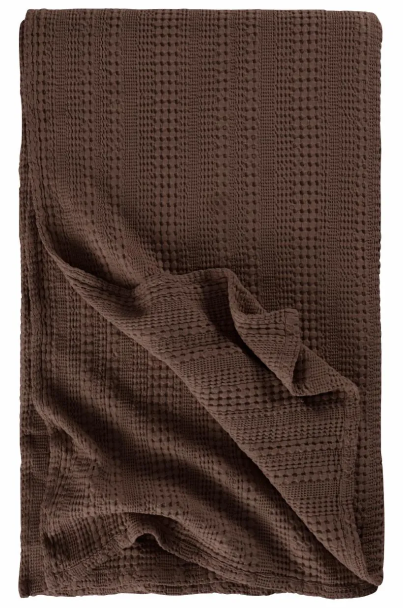 Överkast i härligt mjuk och lätt bomull med mixat våffelmönster som ger fint randmönster. Överkastet passar till enkelsäng och är plaggtvättat vilket innebär att det tvättats efter sömnad för att bli extra mjukt och följsamt. Ett lite bubbligt och livfullt överkast är lika fint när sängen är bäddad som när det ligger löst och ledigt över fotänden på sängen eller får vara pläd på soffans armstöd.