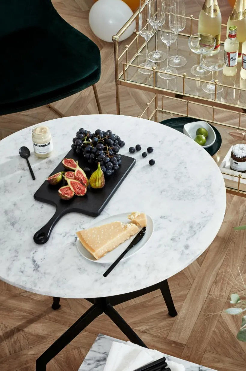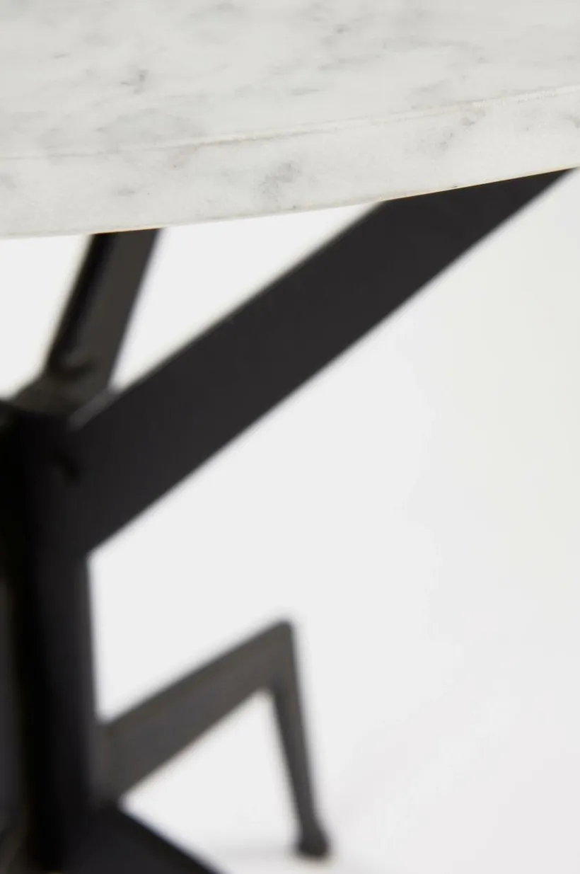 Runt matbord med bordsskiva av marmor och underrede av järn med matt, svart yta. Marmor är klassiskt och med rätt skötsel bevarar du det fint länge. Underredet av järn är en snygg kontrast till bordsskivan både när det gäller den kantiga formen och det ruffa materialet, en snygg mix. Marmor är en natursten och mönstret varierar alltid lite beroende på bergartens sammansättning, vilket gör varje möbel unik. Viss montering krävs.