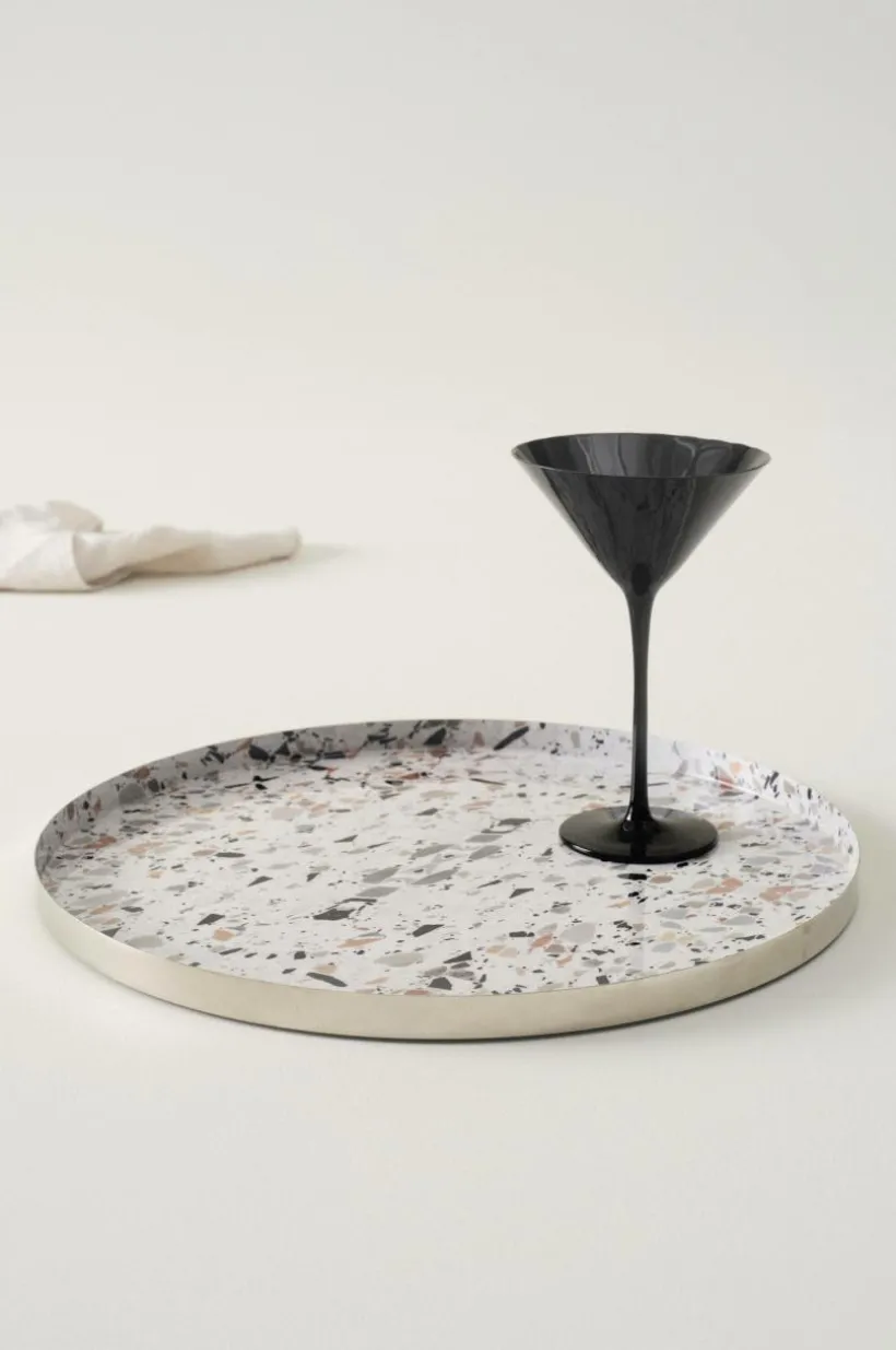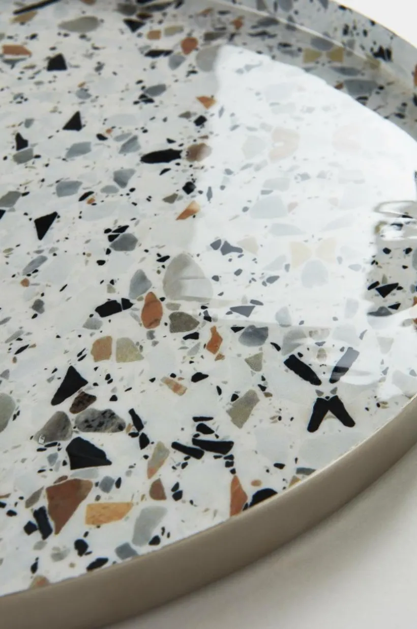Bricka av järn med emaljerad insida som har läckert stänkmönster. Brickan har en praktisk kant runt om.