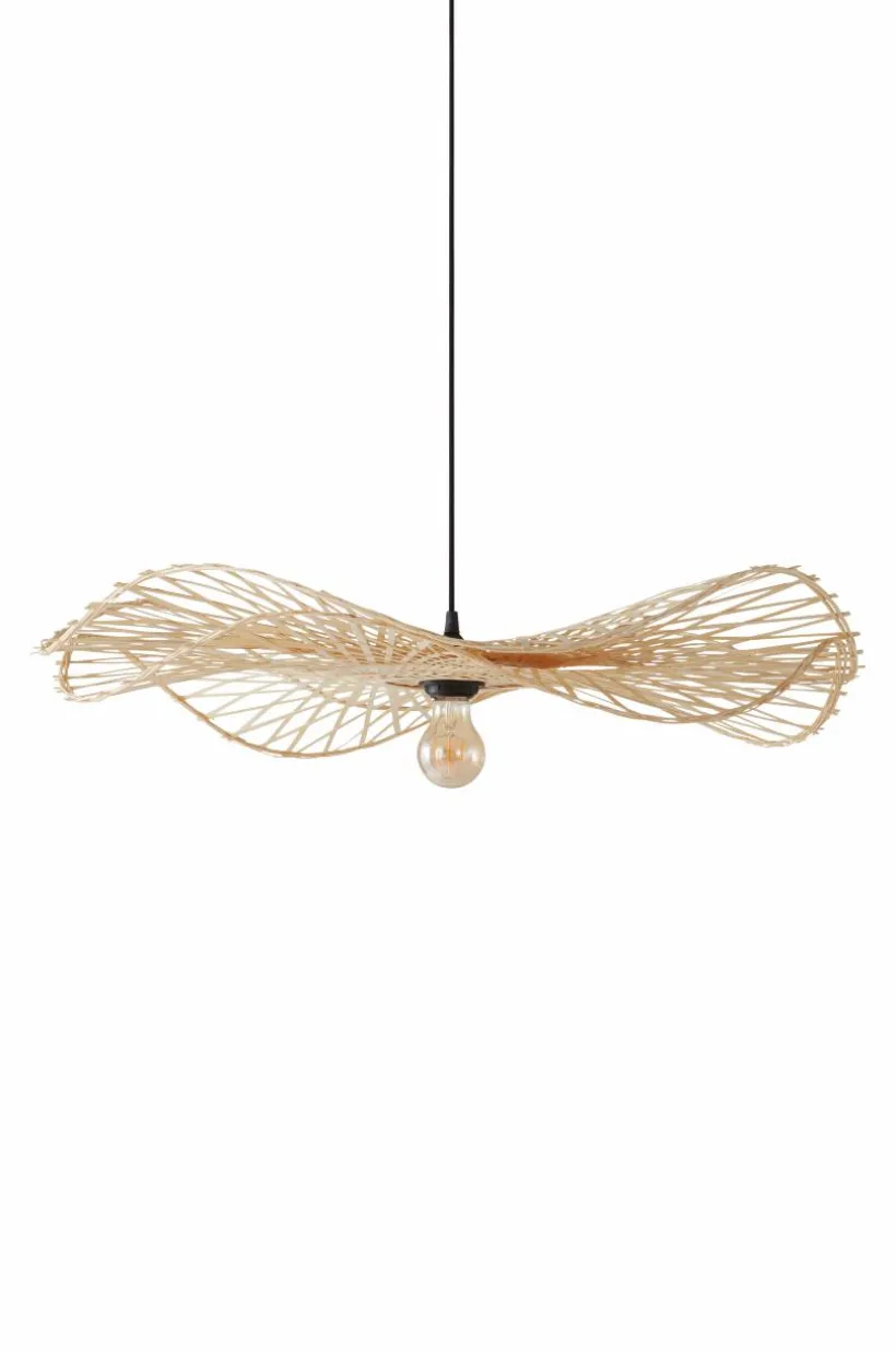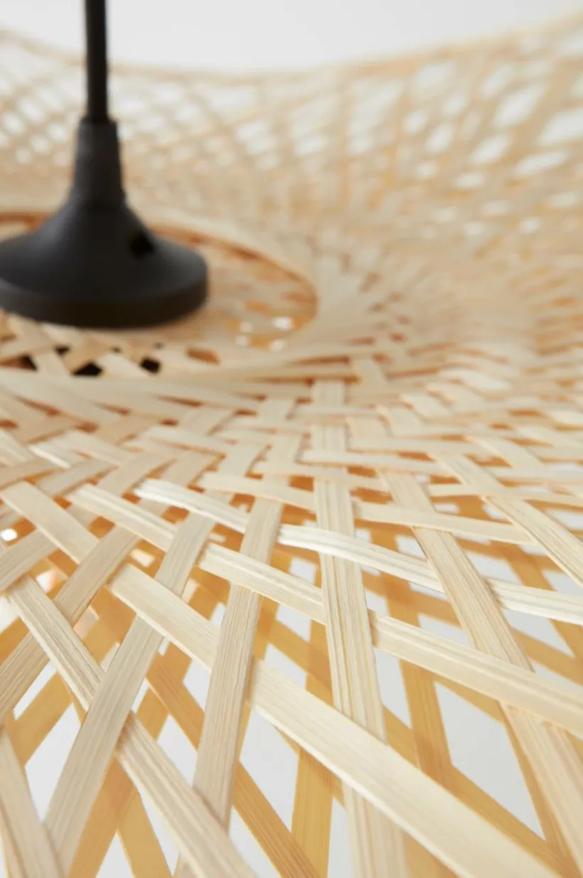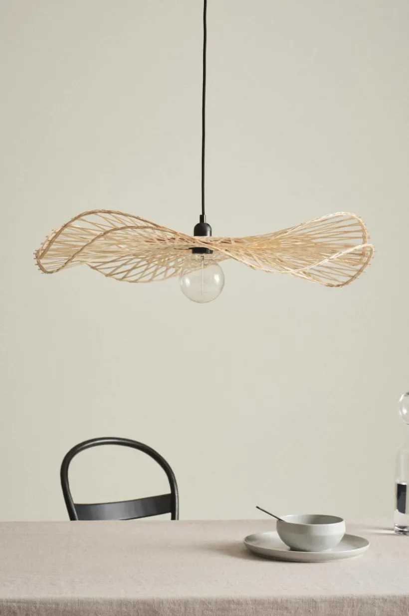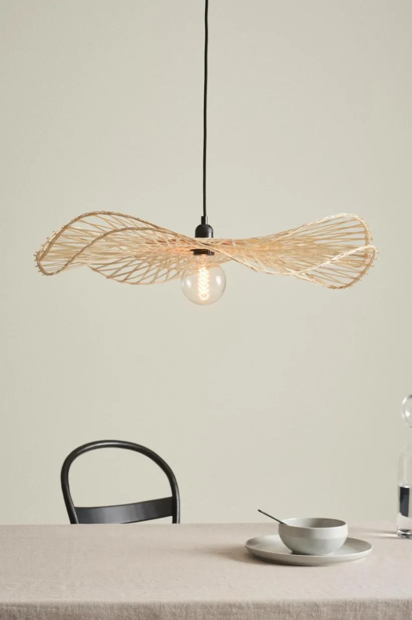 Taklampa i läcker modell med böljande lampskärm av naturlig bambu. Lampfäste och takkopp är av plast. Svart textilsladd. Lampan är ojordad, klass 2. På grund av EU-regler behövs en separat takkontakt i vissa länder. Takkontakten ska vara ojordad (klass 2) och köps separat.
