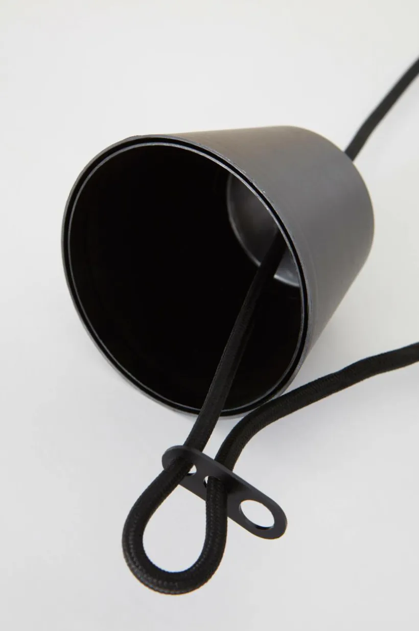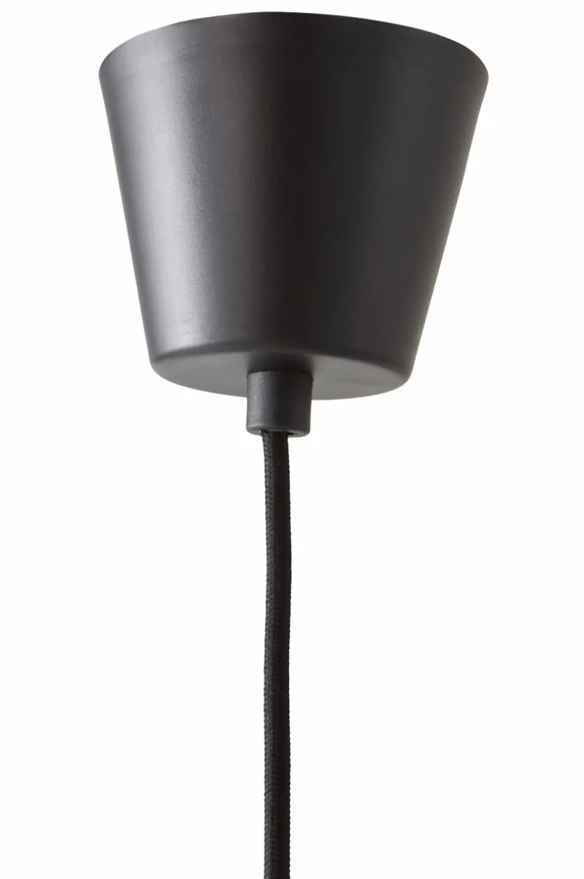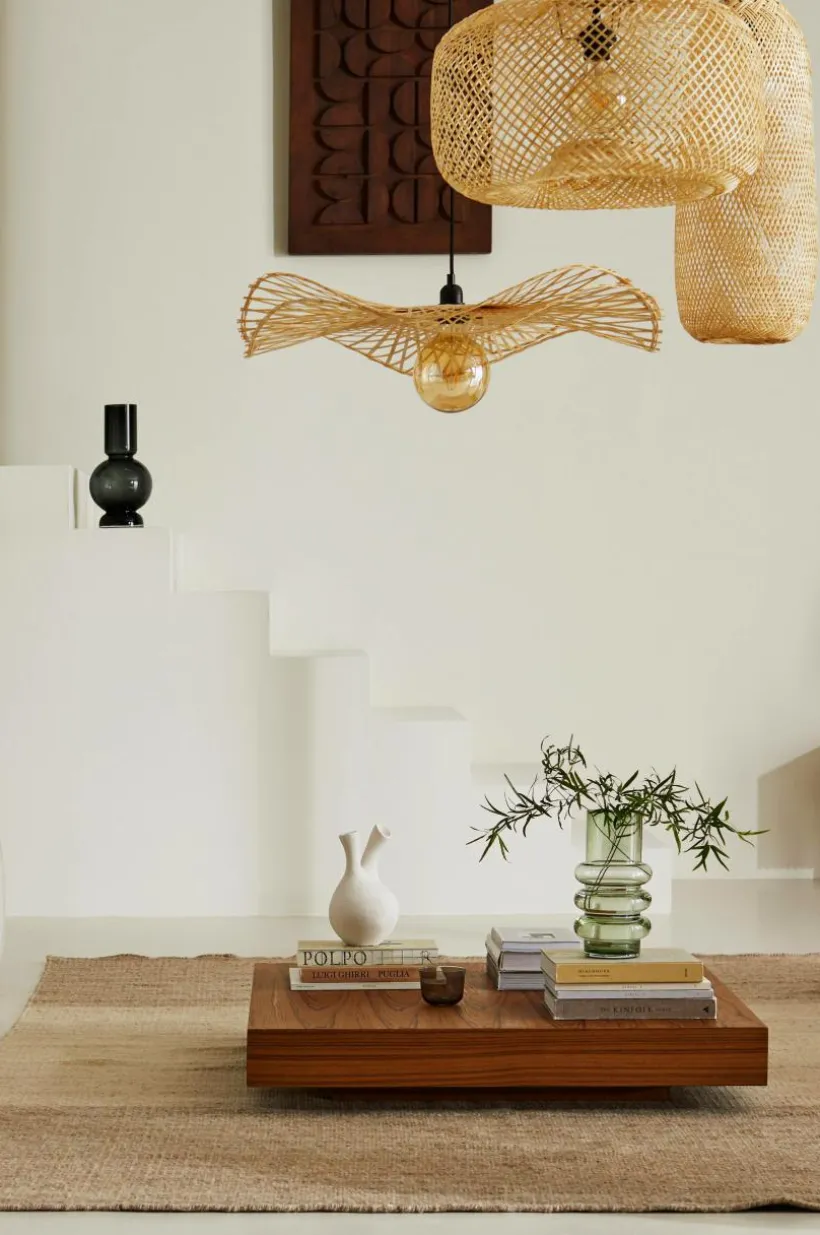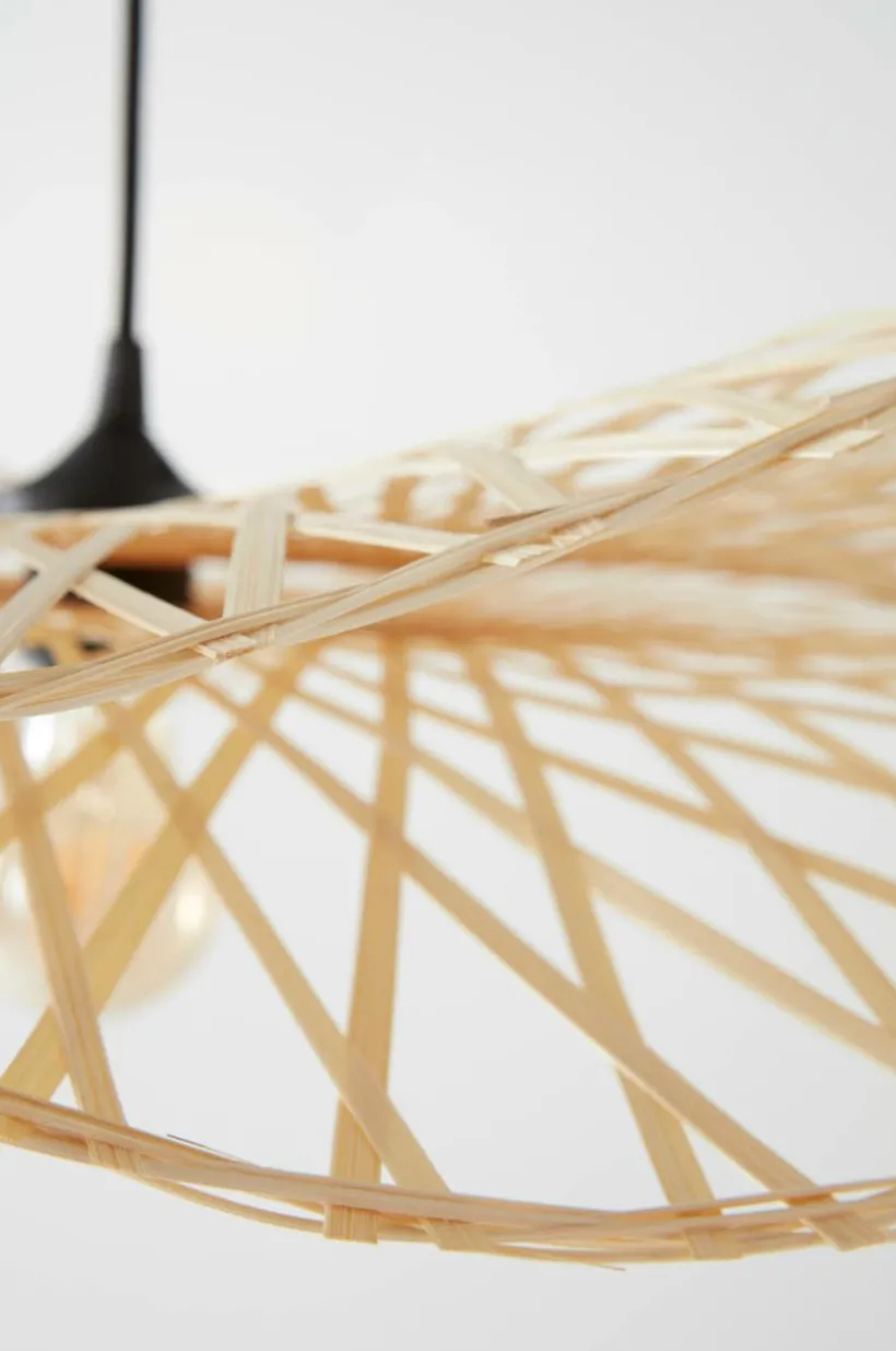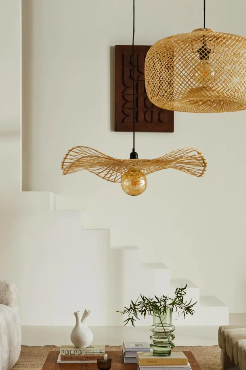 Taklampa i läcker modell med böljande lampskärm av naturlig bambu. Lampfäste och takkopp är av plast. Svart textilsladd. Lampan är ojordad, klass 2. På grund av EU-regler behövs en separat takkontakt i vissa länder. Takkontakten ska vara ojordad (klass 2) och köps separat.